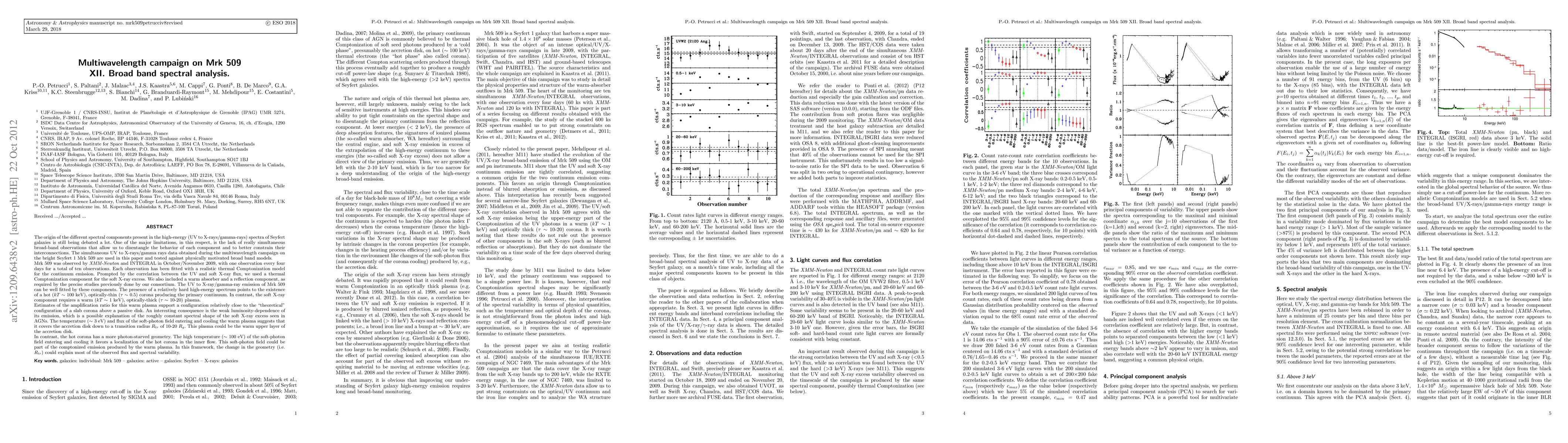 (Abridged) The simultaneous UV to X-rays/gamma rays data obtained during the multi-wavelength XMM/INTEGRAL campaign on the Seyfert 1 Mrk 509 are used in this paper and tested against physically motivated broad band models. Each observation has been fitted with a realistic thermal comptonisation model for the continuum emission. Prompted by the correlation between the UV and soft X-ray flux, we use a thermal comptonisation component for the soft X-ray excess. The UV to X-rays/gamma-rays emission of Mrk 509 can be well fitted by these components. The presence of a relatively hard high-energy spectrum points to the existence of a hot (kT~100 keV), optically-thin (tau~0.5) corona producing the primary continuum. On the contrary, the soft X-ray component requires a warm (kT~1 keV), optically-thick (tau~15) plasma. Estimates of the amplification ratio for this warm plasma support a configuration close to the "theoretical" configuration of a slab corona above a passive disk. An interesting consequence is the weak luminosity-dependence of its emission, a possible explanation of the roughly constant spectral shape of the soft X-ray excess seen in AGNs. The temperature (~ 3 eV) and flux of the soft-photon field entering and cooling the warm plasma suggests that it covers the accretion disk down to a transition radius $R_{tr}$ of 10-20 $R_g$. This plasma could be the warm upper layer of the accretion disk. On the contrary the hot corona has a more photon-starved geometry. The high temperature ($\sim$ 100 eV) of the soft-photon field entering and cooling it favors a localization of the hot corona in the inner flow. This soft-photon field could be part of the comptonised emission produced by the warm plasma. In this framework, the change in the geometry (i.e. $R_{tr}$) could explain most of the observed flux and spectral variability.