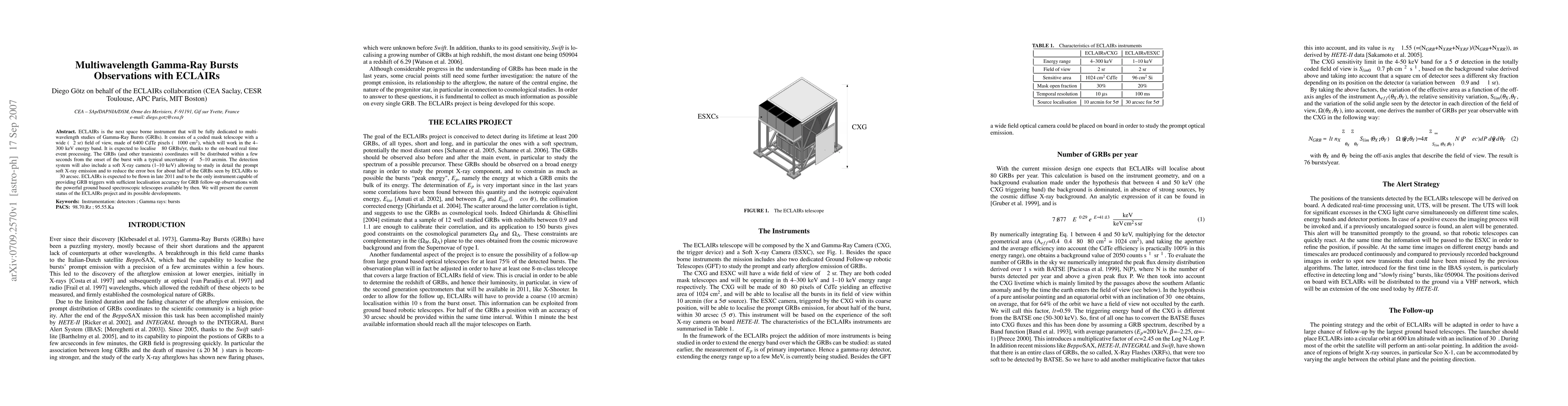 ECLAIRs is an upcoming space-borne instrument designed for the multi-wavelength study of Gamma-Ray Bursts (GRBs), featuring a coded mask telescope and a soft X-ray camera to localize and study GRBs with high accuracy. Expected to launch in late 2011, it aims to provide precise GRB triggers for follow-up observations with ground-based telescopes.