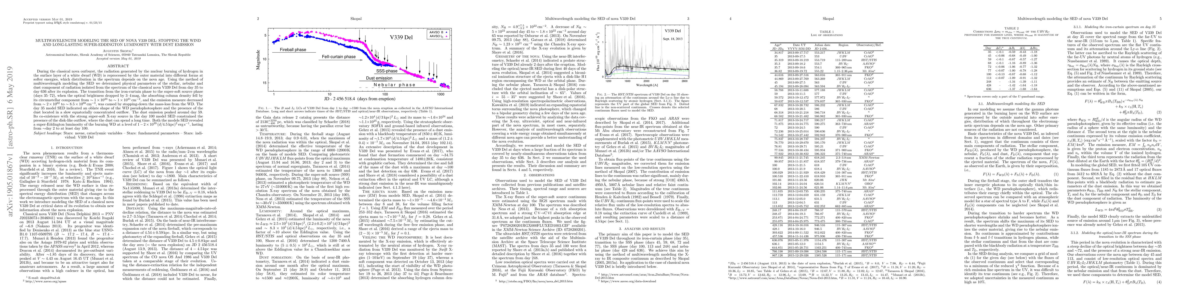 During the classical nova outburst, the radiation generated by the nuclear burning of hydrogen in the surface layer of a white dwarf (WD) is reprocessed by the outer material into different forms at softer energies, which distribution in the spectrum depends on the nova age. Using the method of multiwavelength modeling the SED we determined physical parameters of the stellar, nebular and dust component of radiation isolated from the spectrum of the classical nova V339 Del from day 35 to day 636 after its explosion. The transition from the iron-curtain phase to the super-soft source phase (days 35 - 72), when the optical brightness dropped by 3-4 mag, the absorbing column density fell by its circumstellar component from $\sim 1\times 10^{23}$ to $\sim 1\times 10^{21}$ cm$^{-2}$, and the emission measure decreased from $\sim 2\times 10^{62}$ to $\sim 8.5\times 10^{60}$ cm$^{-3}$, was caused by stopping-down the mass-loss from the WD. The day 35 model SED indicated an oblate shape of the WD pseudophotosphere and the presence of the dust located in a slow equatorially concentrated outflow. The dust emission peaked around day 59. Its co-existence with the strong super-soft X-ray source in the day 100 model SED constrained the presence of the disk-like outflow, where the dust can spend a long time. Both the models SED revealed a super-Eddington luminosity of the burning WD at a level of $1-2\times 10^{39}\,(d/4.5{\rm kpc})^2$ erg s$^{-1}$, lasting from $\sim$day 2 to at least day 100.