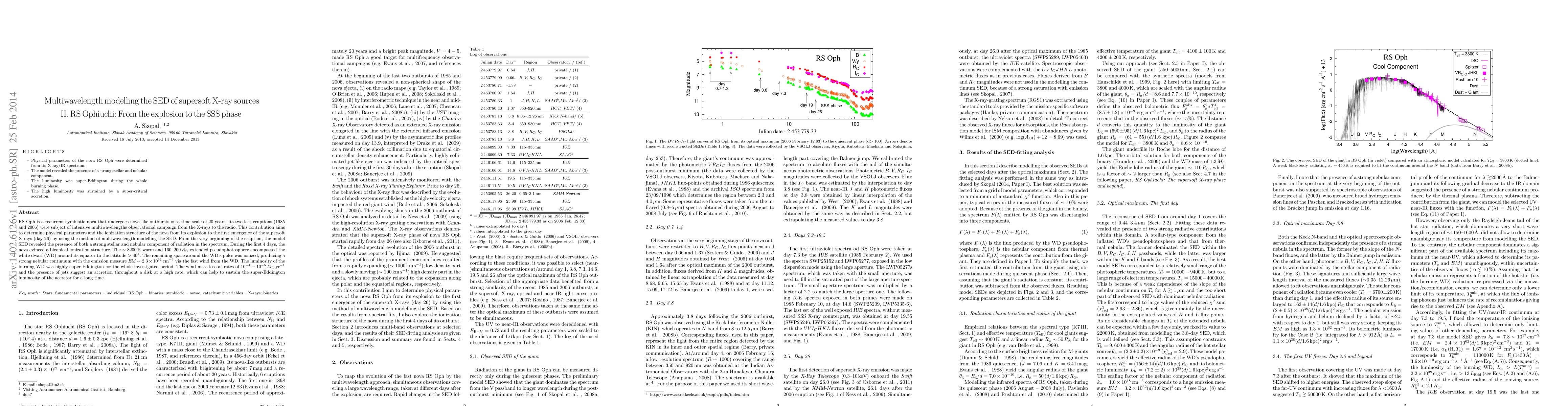 This paper models the spectral energy distribution (SED) of RS Ophiuchi, a recurrent symbiotic nova, from its eruption to the emergence of supersoft X-rays, revealing a highly super-Eddington luminosity and a biconical ionization structure with a pseudo-photosphere around the white dwarf, driven by accretion and high-rate wind mass loss.