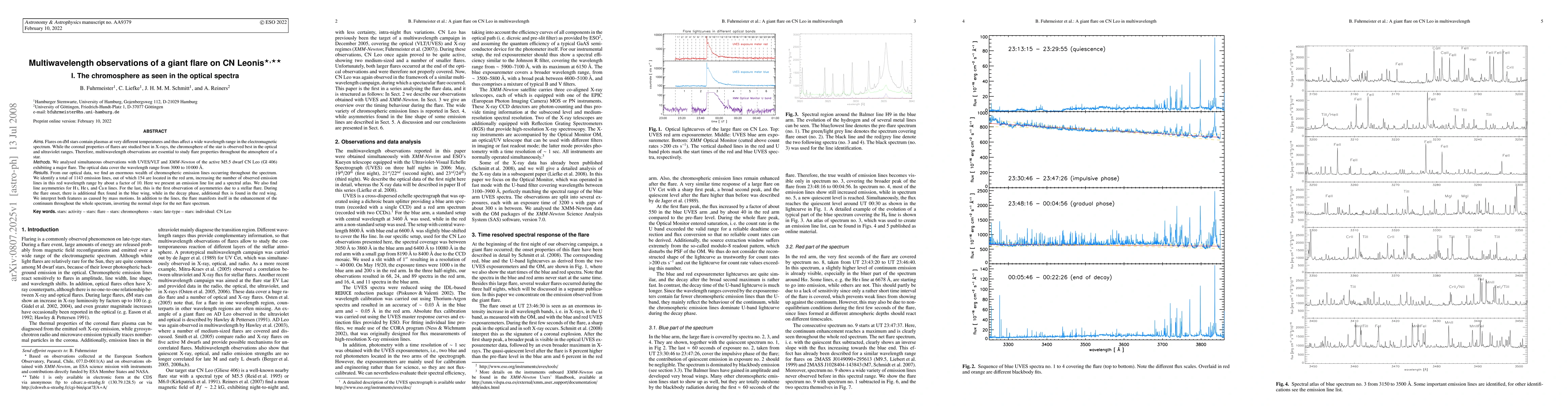 This paper reports on multiwavelength observations of a major flare on the active M5.5 dwarf CN Leo, focusing on the star's chromosphere through optical spectra. The study identifies 1143 emission lines, significantly increasing the number observed in the red wavelength range, and finds line asymmetries indicative of mass motions during the flare.