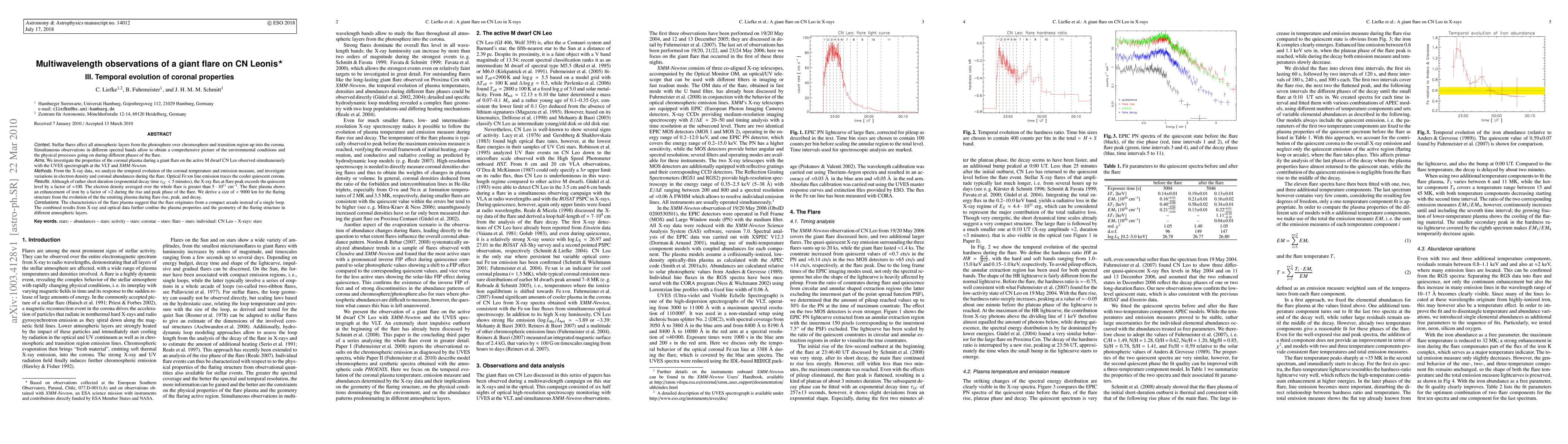 This paper investigates a giant flare on the M dwarf CN Leo using multiwavelength observations, revealing significant changes in coronal temperature, emission measure, and electron density. The flare's compact nature suggests it originates from a multi-loop arcade rather than a single loop, with iron abundance doubling during the flare's peak phase.