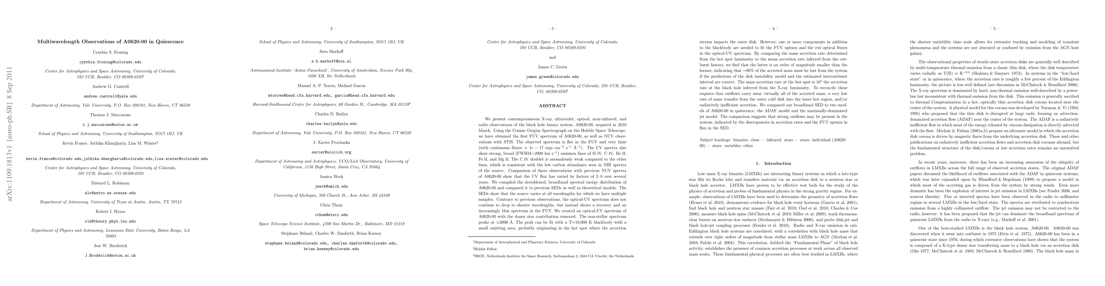 [Abridged.] We present multiwavelength observations of the black hole binary system, A0620-00. Using the Cosmic Origins Spectrograph on the Hubble Space Telescope, we have obtained the first FUV spectrum of A0620-00. The observed spectrum is flat in the FUV and very faint (with continuum fluxes \simeq 1e - 17 ergs/cm^2/s/A). We compiled the dereddened, broadband spectral energy distribution of A0620-00 and compared it to previous SEDs as well as theoretical models. The SEDs show that the source varies at all wavelengths for which we have multiple samples. Contrary to previous observations, the optical-UV spectrum does not continue to drop to shorter wavelengths, but instead shows a recovery and an increasingly blue spectrum in the FUV. We created an optical-UV spectrum of A0620-00 with the donor star contribution removed. The non-stellar spectrum peaks at \simeq3000 {\deg}A. The peak can be fit with a T=10,000 K blackbody with a small emitting area, probably originating in the hot spot where the accretion stream impacts the outer disk. However, one or more components in addition to the blackbody are needed to fit the FUV upturn and the red optical fluxes in the optical-UV spectrum. By comparing the mass accretion rate determined from the hot spot luminosity to the mean accretion rate inferred from the outburst history, we find that the latter is an order of magnitude smaller than the former, indicating that \sim90% of the accreted mass must be lost from the system if the predictions of the disk instability model and the estimated interoutburst interval are correct. The mass accretion rate at the hot spot is 10^5 the accretion rate at the black hole inferred from the X-ray luminosity. To reconcile these requires that outflows carry away virtually all of the accreted mass, a very low rate of mass transfer from the outer cold disk into the inner hot region, and/or radiatively inefficient accretion.