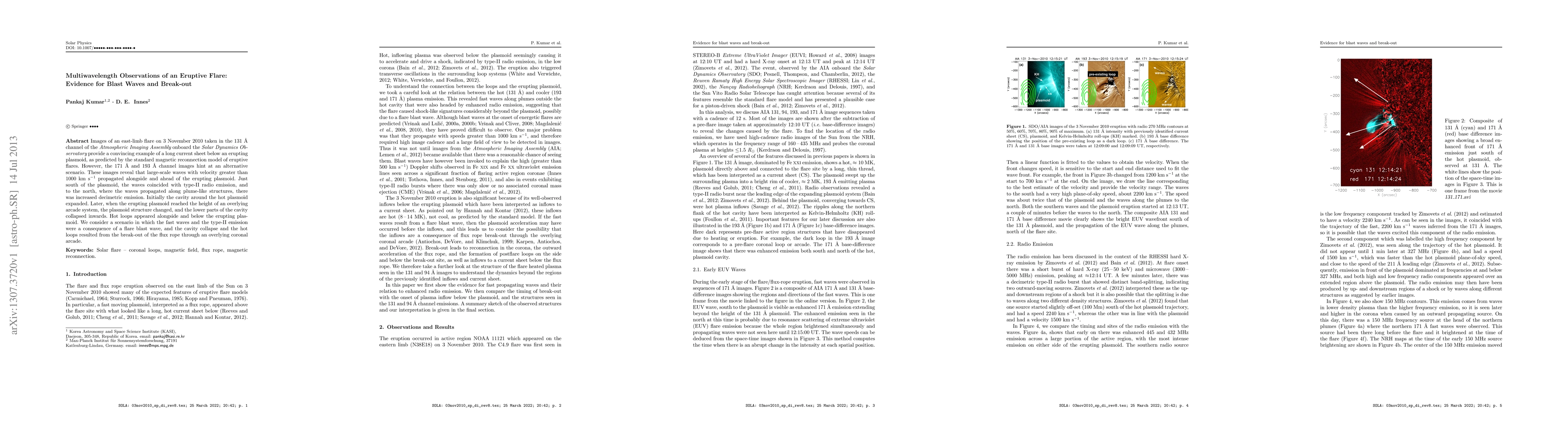 Images of an east-limb flare on 3 November 2010 taken in the 131 \AA\ channel of the Atmospheric Imaging Assembly onboard the Solar Dynamics Observatory provide a convincing example of a long current sheet below an erupting plasmoid, as predicted by the standard magnetic reconnection model of eruptive flares. However, the 171 \AA\ and 193 \AA\ channel images hint at an alternative scenario. These images reveal that large-scale waves with velocity greater than 1000 km/s propagated alongside and ahead of the erupting plasmoid. Just south of the plasmoid, the waves coincided with type-II radio emission, and to the north, where the waves propagated along plume-like structures, there was increased decimetric emission. Initially the cavity around the hot plasmoid expanded. Later, when the erupting plasmoid reached the height of an overlying arcade system, the plasmoid structure changed, and the lower parts of the cavity collapsed inwards. Hot loops appeared alongside and below the erupting plasmoid. We consider a scenario in which the fast waves and the type-II emission were a consequence of a flare blast wave, and the cavity collapse and the hot loops resulted from the break-out of the flux rope through an overlying coronal arcade.