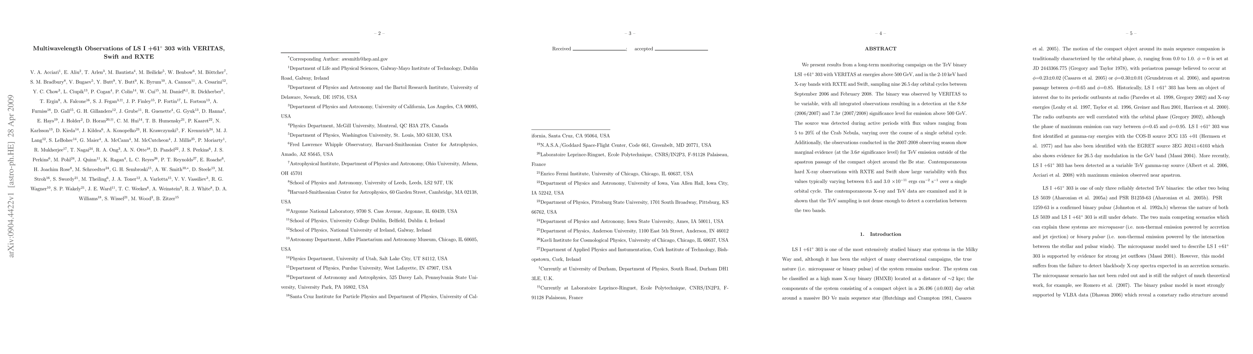 The research paper presents multiwavelength observations of binary LSI +61 303, detecting variable TeV emission with VERITAS and large hard X-ray variability with RXTE and Swift, without a correlation between the two bands.