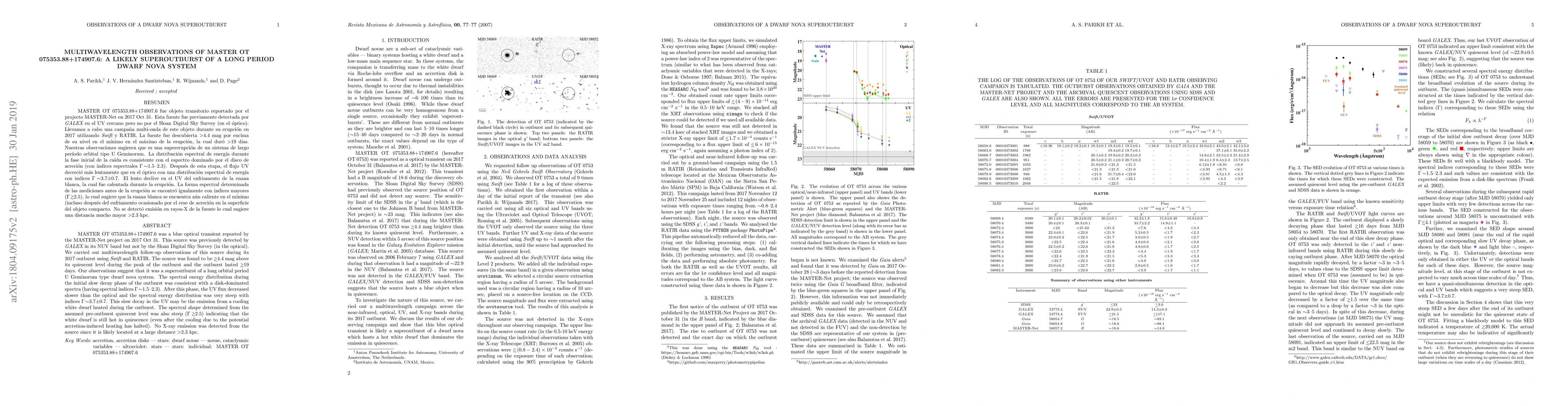 MASTER OT 075353.88+174907.6 was a blue optical transient reported by the MASTER-Net project on 2017 Oct 31. This source was previously detected by {\it GALEX} in its NUV band but not by the Sloan Digital Sky Survey (in the optical). We carried out multiwavelength follow-up observations of this source during its 2017 outburst using {\it Swift} and RATIR. The source was found to be $\gtrsim$4.4 mag above its quiescent level during the peak of the outburst and the outburst lasted $\gtrsim$19 days. Our observations suggest that it was a superoutburst of a long orbital period U Geminorum type dwarf nova system. The spectral energy distribution during the initial slow decay phase of the outburst was consistent with a disk-dominated spectra (having spectral indices $\Gamma \! \sim$1.5--2.3). After this phase, the UV flux decreased slower than the optical and the spectral energy distribution was very steep with indices $\Gamma \! \sim$3.7$\pm$0.7. This slow decay in the UV may be the emission from a cooling white dwarf heated during the outburst. The spectral shape determined from the assumed pre-outburst quiescent level was also steep ($\Gamma \! \gtrsim$2.5) indicating that the white dwarf is still hot in quiescence (even after the cooling due to the potential accretion-induced heating has halted). No X-ray emission was detected from the source since it is likely located at a large distance $>$2.3 kpc.
