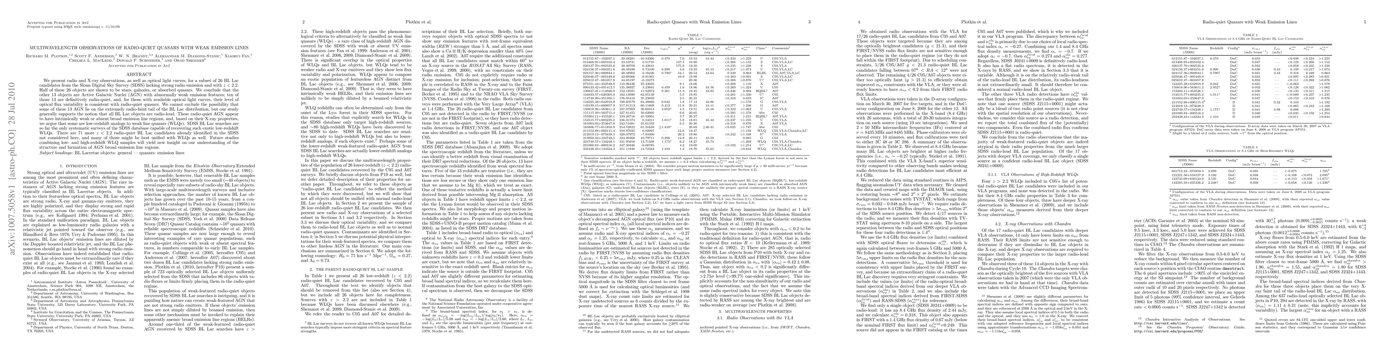 This paper investigates 26 radio-quiet quasar candidates from the SDSS, identifying 13 as AGN with weak emission lines, potentially low-redshift analogs to weak line quasars. The study suggests that BL Lac objects are predominantly radio-loud, with these findings offering insight into the structure and formation of AGN emission line regions.