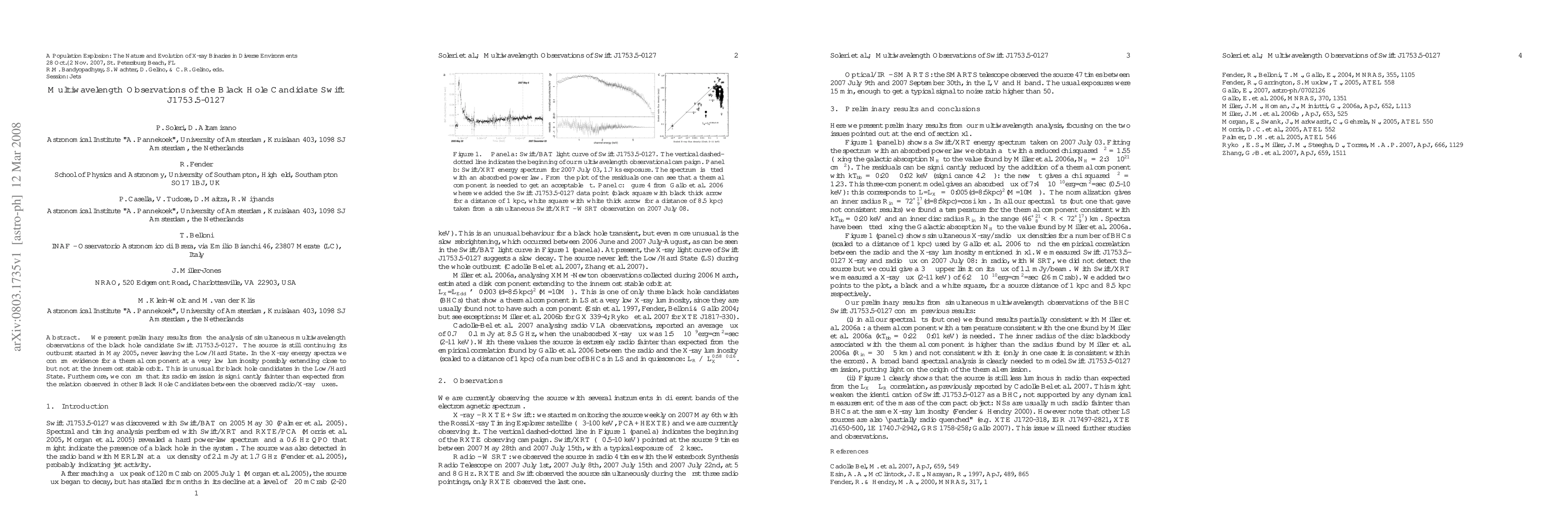 We present preliminary results from the analysis of simultaneous multiwavelength observations of the black hole candidate Swift J1753.5-0127. The source is still continuing its outburst started in May 2005, never leaving the Low/Hard State. In the X-ray energy spectra we confirm evidence for a thermal component at a very low luminosity possibly extending close to but not at the innermost stable orbit. This is unusual for black hole candidates in the Low/Hard State. Furthermore, we confirm that its radio emission is significantly fainter than expected from the relation observed in other black hole candidates between the observed radio/X-ray fluxes.