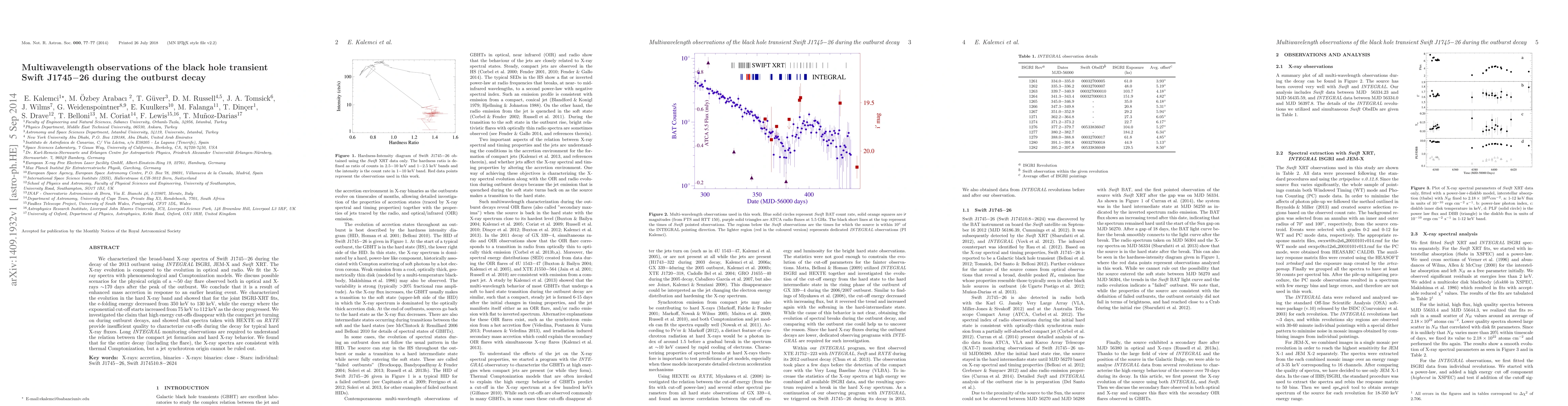 We characterized the broad-band X-ray spectra of Swift J1745-26 during the decay of the 2013 outburst using INTEGRAL ISGRI, JEM-X and Swift XRT. The X-ray evolution is compared to the evolution in optical and radio. We fit the X- ray spectra with phenomenological and Comptonization models. We discuss possible scenarios for the physical origin of a ~50 day flare observed both in optical and X- rays ~170 days after the peak of the outburst. We conclude that it is a result of enhanced mass accretion in response to an earlier heating event. We characterized the evolution in the hard X-ray band and showed that for the joint ISGRI-XRT fits, the e-folding energy decreased from 350 keV to 130 keV, while the energy where the exponential cut-off starts increased from 75 keV to 112 keV as the decay progressed.We investigated the claim that high energy cut-offs disappear with the compact jet turning on during outburst decays, and showed that spectra taken with HEXTE on RXTE provide insufficient quality to characterize cut-offs during the decay for typical hard X-ray fluxes. Long INTEGRAL monitoring observations are required to understand the relation between the compact jet formation and hard X-ray behavior. We found that for the entire decay (including the flare), the X-ray spectra are consistent with thermal Comptonization, but a jet synchrotron origin cannot be ruled out.