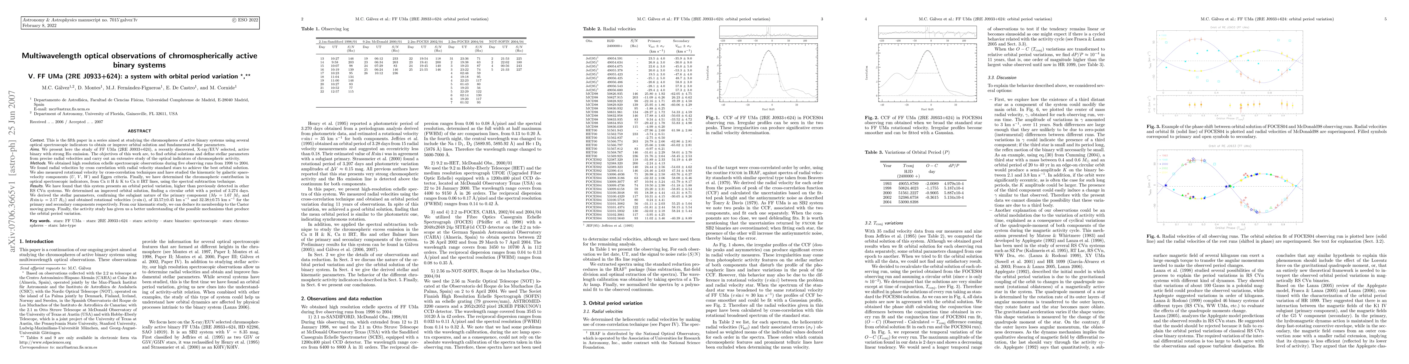 This is the fifth paper in a series aimed at studying the chromospheres of active binary systems using several optical spectroscopic indicators to obtain or improve orbital solution and fundamental stellar parameters. We present here the study of FF UMa (2RE J0933+624), a recently discovered, X-ray/EUV selected, active binary with strong H_alpha emission. The objectives of this work are, to find orbital solutions and define stellar parameters from precise radial velocities and carry out an extensive study of the optical indicators of chromospheric activity. We obtained high resolution echelle spectroscopic observations during five observing runs from 1998 to 2004. We found radial velocities by cross correlation with radial velocity standard stars to achieve the best orbital solution. We also measured rotational velocity by cross-correlation techniques and have studied the kinematic by galactic space- velocity components (U, V, W) and Eggen criteria. Finally, we have determined the chromospheric contribution in optical spectroscopic indicators, from Ca II H & K to Ca II IRT lines, using the spectral subtraction technique. We have found that this system presents an orbital period variation, higher than previously detected in other RS CVn systems. We determined an improved orbital solution, finding a circular orbit with a period of 3.274 days. We derived the stellar parameters, confirming the subgiant nature of the primary component and obtained rotational velocities (vsini), of 33.57 km/s and 32.38 km/s for the primary and secondary components respectively. From our kinematic study, we can deduce its membership to the Castor moving group. Finally, the activity study has given us a better understanding of the possible mechanisms that produce the orbital period variation.