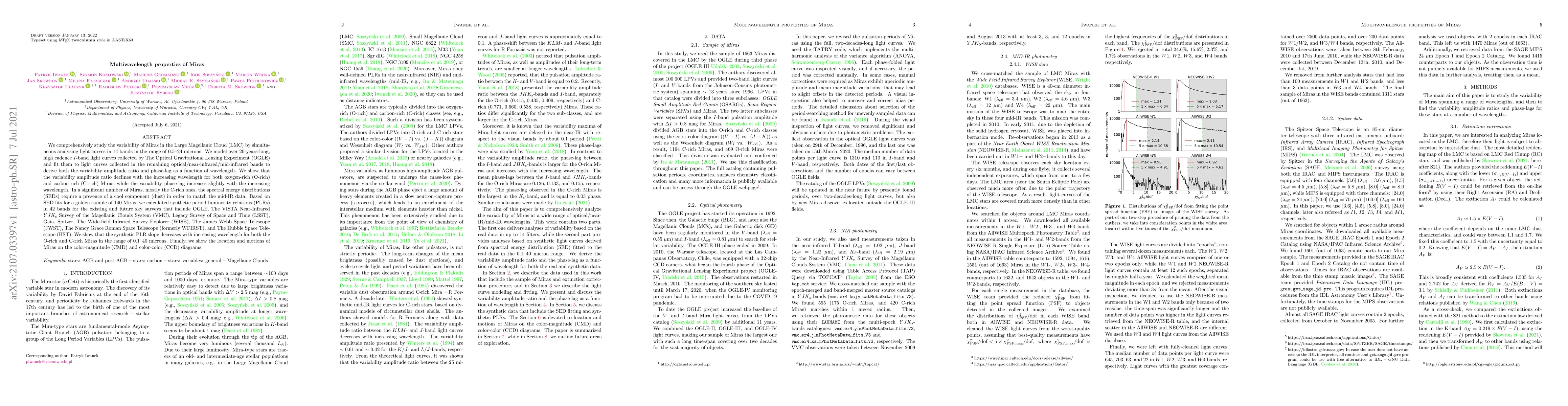 This study analyzes the variability of Miras in the LMC across 14 bands (0.5-24 microns), finding that variability amplitude ratio decreases with increasing wavelength for both O-rich and C-rich Miras. Phase-lag increases slightly with wavelength. Synthetic period-luminosity relations (PLRs) are derived for various surveys, showing PLR slope decreases with wavelength for both Mira types. The research also explores Mira locations on color-magnitude and color-color diagrams.