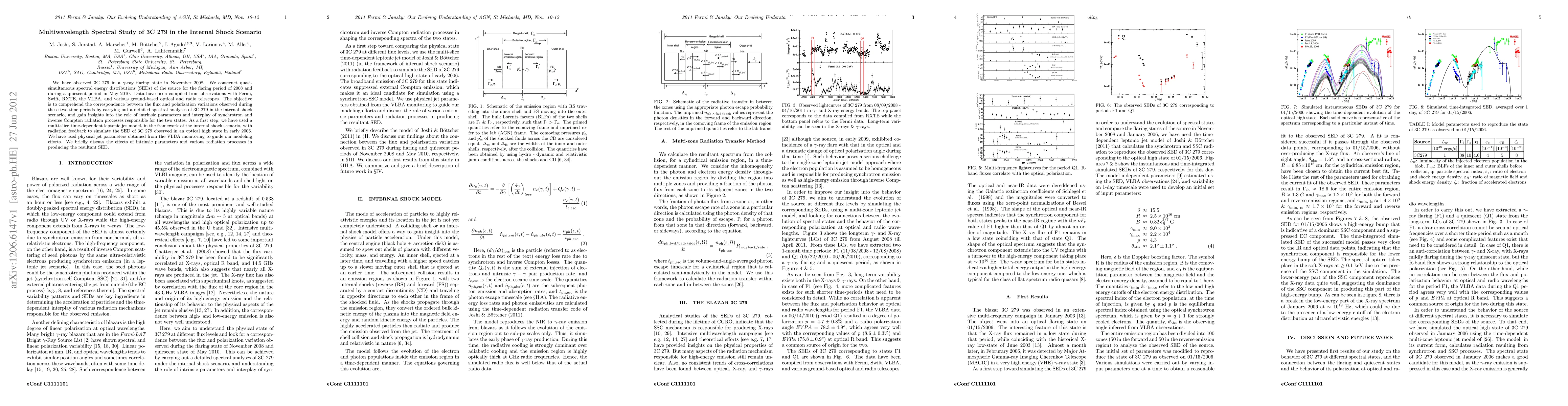 We have observed 3C~279 in a gamma-ray flaring state in November 2008. We construct quasi-simultaneous spectral energy distributions (SEDs) of the source for the flaring period of 2008 and during a quiescent period in May 2010. Data have been compiled from observations with Fermi, Swift, RXTE, the VLBA, and various ground-based optical and radio telescopes. The objective is to comprehend the correspondence between the flux and polarization variations observed during these two time periods by carrying out a detailed spectral analyses of 3C~279 in the internal shock scenario, and gain insights into the role of intrinsic parameters and interplay of synchrotron and inverse Compton radiation processes responsible for the two states. As a first step, we have used a multi-slice time-dependent leptonic jet model, in the framework of the internal shock scenario, with radiation feedback to simulate the SED of 3C~279 observed in an optical high state in early 2006. We have used physical jet parameters obtained from the VLBA monitoring to guide our modeling efforts. We briefly discuss the effects of intrinsic parameters and various radiation processes in producing the resultant SED.