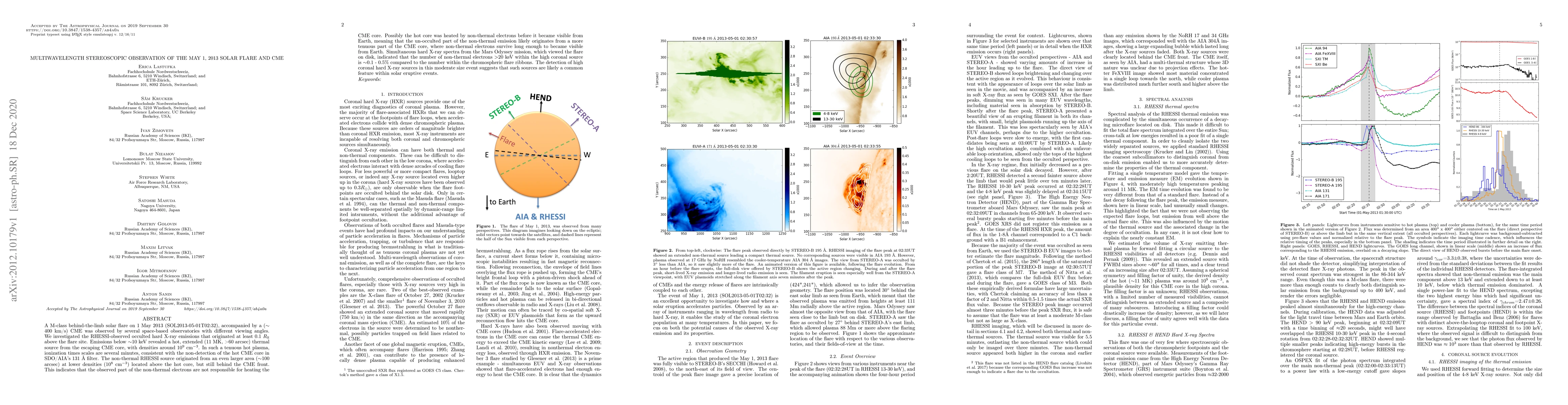 A M-class behind-the-limb solar flare on 1 May 2013 (SOL2013-05-01T02:32), accompanied by a ($\sim$ 400 km/s) CME was observed by several space-based observatories with different viewing angles. We investigated the RHESSI-observed occulted hard X-ray emissions that originated at least 0.1 \solrad{} above the flare site. Emissions below $\sim$10 keV revealed a hot, extended (11 MK, >60 arcsec) thermal source from the escaping CME core, with densities around $10^{9}$ cm$^{-3}$. In such a tenuous hot plasma, ionization times scales are several minutes, consistent with the non-detection of the hot CME core in SDO/AIA's 131 \AA{} filter. The non-thermal RHESSI source originated from an even larger area ($\sim$100 arcsec) at lower densities ($10^{8}$ cm$^{-3}$) located above the hot core, but still behind the CME front. This indicates that the observed part of the non-thermal electrons are not responsible for heating the CME core. Possibly the hot core was heated by non-thermal electrons before it became visible from Earth, meaning that the un-occulted part of the non-thermal emission likely originates from a more tenuous part of the CME core, where non-thermal electrons survive long enough to became visible from Earth. Simultaneous hard X-ray spectra from the Mars Odyssey mission, which viewed the flare on disk, indicated that the number of non-thermal electrons $>$20 keV within the high coronal source is $\sim$0.1 - 0.5\% compared to the number within the chromospheric flare ribbons. The detection of high coronal hard X-ray sources in this moderate size event suggests that such sources are likely a common feature within solar eruptive events.