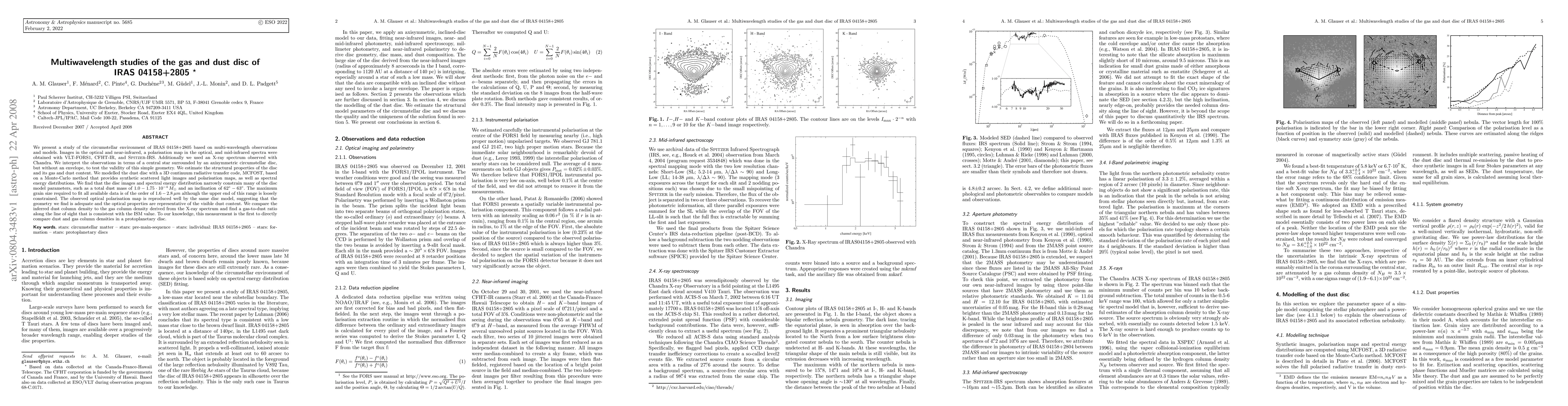 We present a study of the circumstellar environment of IRAS 04158+2805 based on multi-wavelength observations and models. Images in the optical and near-infrared, a polarisation map in the optical, and mid-infrared spectra were obtained with VLT-FORS1, CFHT-IR, and Spitzer-IRS. Additionally we used an X-ray spectrum observed with Chandra. We interpret the observations in terms of a central star surrounded by an axisymmetric circumstellar disc, but without an envelope, to test the validity of this simple geometry. We estimate the structural properties of the disc and its gas and dust content. We modelled the dust disc with a 3D continuum radiative transfer code, MCFOST, based on a Monte-Carlo method that provides synthetic scattered light images and polarisation maps, as well as spectral energy distributions. We find that the disc images and spectral energy distribution narrowly constrain many of the disc model parameters, such as a total dust mass of 1.0-1.75x10^-4 sollar masses and an inclination of 62-63 degrees. The maximum grain size required to fit all available data is of the order of 1.6-2.8 microns although the upper end of this range is loosely constrained. The observed optical polarisation map is reproduced well by the same disc model, suggesting that the geometry we find is adequate and the optical properties are representative of the visible dust content. We compare the inferred dust column density to the gas column density derived from the X-ray spectrum and find a gas-to-dust ratio along the line of sight that is consistent with the ISM value. To our knowledge, this measurement is the first to directly compare dust and gas column densities in a protoplanetary disc.