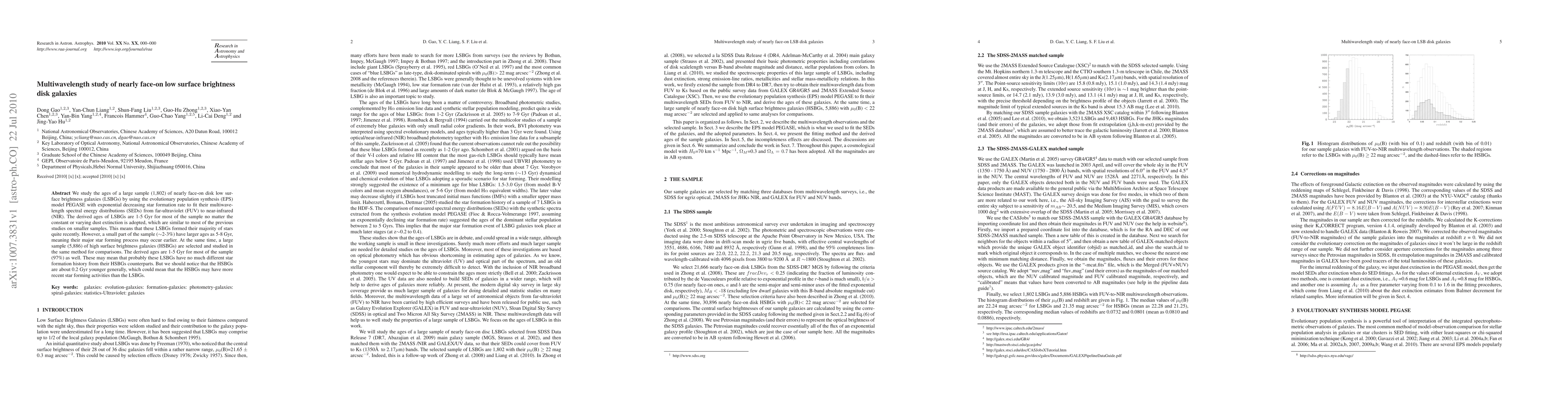 We study the ages of a large sample (1,802) of nearly face-on disk low surface brightness galaxies (LSBGs) by using the evolutionary population synthesis (EPS) model PEGASE with exponential decreasing star formation rate to fit their multiwavelength spectral energy distributions (SEDs) from far-ultraviolet (FUV) to near-infrared (NIR). The derived ages of LSBGs are 1-5 Gyr for most of the sample no matter the constant or varying dust extinction is adopted, which are similar to most of the previous studies on smaller samples. This means that these LSBGs formed their majority of stars quite recently. However, a small part of the sample (~2-3%) have larger ages as 5-8 Gyr, meaning their major star forming process may occur earlier. At the same time, a large sample (5,886) of high surface brightness galaxies (HSBGs) are selected and studied in the same method for comparisons. The derived ages are 1-5 Gyr for most of the sample (97%) as well. These may mean that probably these LSBGs have no much different star formation history from their HSBGs counterparts. But we should notice that the HSBGs are about 0.2 Gyr younger generally, which could mean that the HSBGs may have more recent star forming activities than the LSBGs.