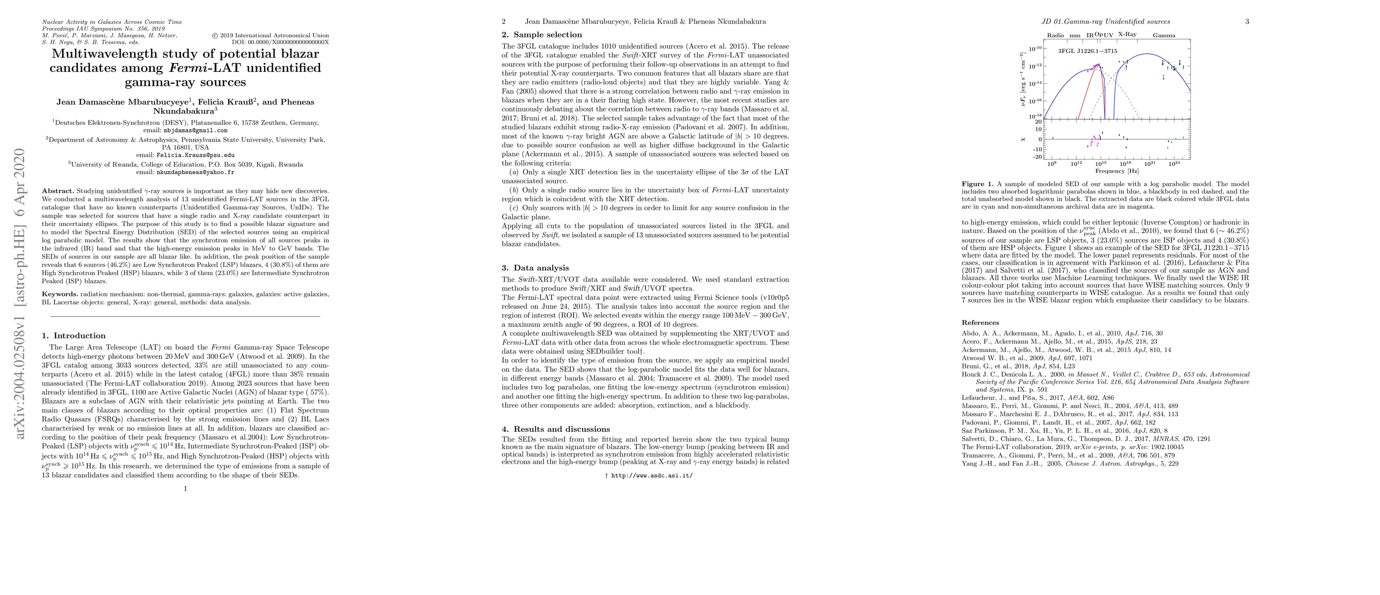 This study analyzes 13 unidentified Fermi-LAT gamma-ray sources using multiwavelength data to identify potential blazar candidates. The results show that all sources exhibit blazar-like Spectral Energy Distributions, with 46% being Low Synchrotron Peaked blazars, 31% High Synchrotron Peaked, and 23% Intermediate Synchrotron Peaked.