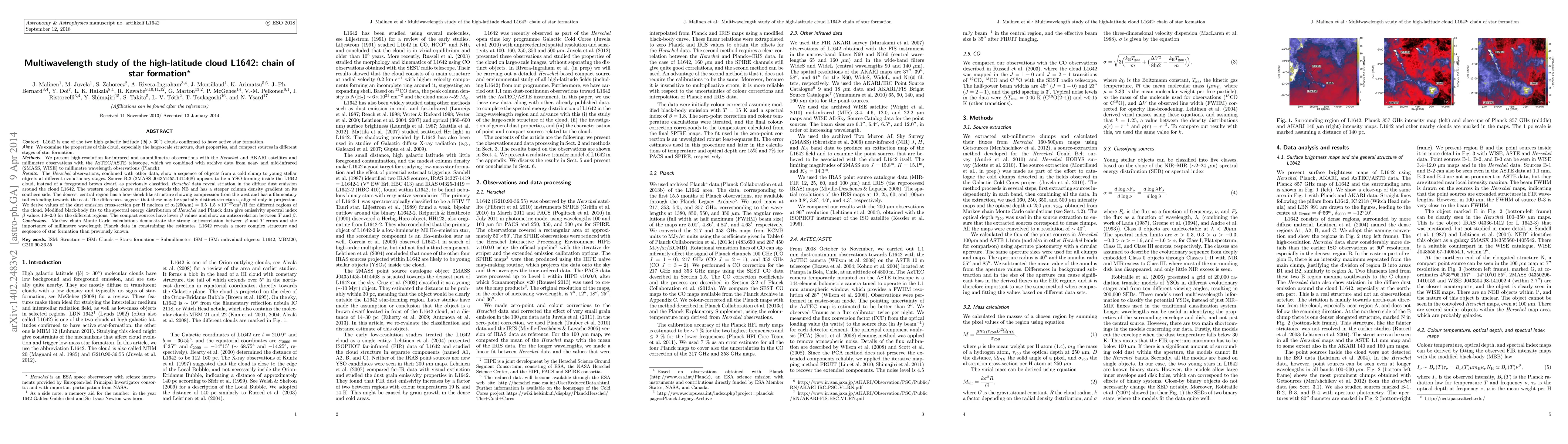 L1642 is one of the two high galactic latitude (|b| > 30deg) clouds confirmed to have active star formation. We examine the properties of this cloud, especially the large-scale structure, dust properties, and compact sources in different stages of star formation. We present high-resolution far-infrared and submm observations with the Herschel and AKARI satellites and mm observations with the AzTEC/ASTE telescope, which we combined with archive data from near- and mid-infrared (2MASS, WISE) to mm observations (Planck). The Herschel observations, combined with other data, show a sequence of objects from a cold clump to young stellar objects at different evolutionary stages. Source B-3 (2MASS J04351455-1414468) appears to be a YSO forming inside the L1642 cloud, instead of a foreground brown dwarf, as previously classified. Herschel data reveal striation in the diffuse dust emission around L1642. The western region shows striation towards NE and has a steeper column density gradient on its southern side. The densest central region has a bow-shock like structure showing compression from the west and a filamentary tail extending towards east. The differences suggest that these may be spatially distinct structures, aligned only in projection. We derive values of the dust emission cross-section per H nucleon for different regions of the cloud. Modified black-body fits to the spectral energy distribution of Herschel and Planck data give emissivity spectral index beta values 1.8-2.0 for the different regions. The compact sources have lower beta values and show an anticorrelation between T and beta. Markov chain Monte Carlo calculations demonstrate the strong anticorrelation between beta and T errors and the importance of mm Planck data in constraining the estimates. L1642 reveals a more complex structure and sequence of star formation than previously known.
