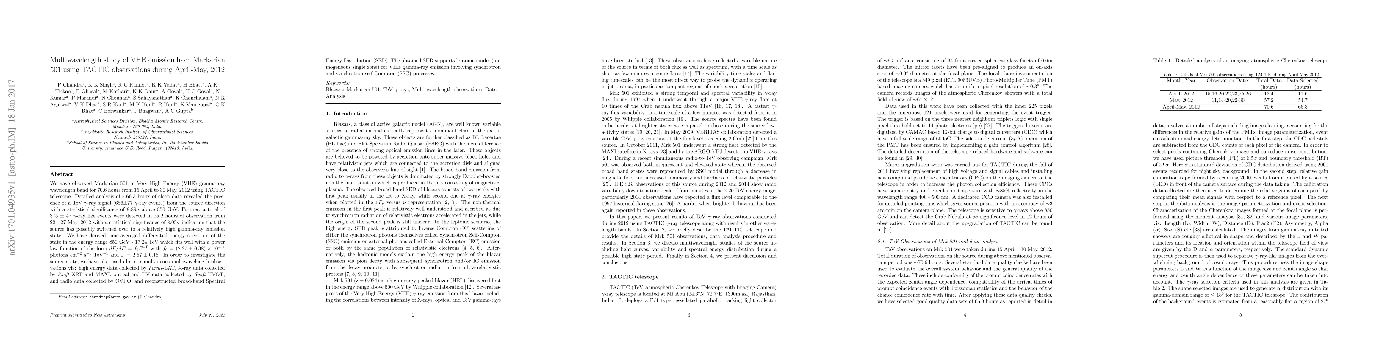 We have observed Markarian 501 in Very High Energy (VHE) gamma-ray wavelength band for 70.6 hours from 15 April to 30 May, 2012 using TACTIC telescope. Detailed analysis of $\sim$66.3 hours of clean data revealed the presence of a TeV $\gamma$-ray signal (686$\pm$77 $\gamma$-ray events) from the source direction with a statistical significance of 8.89$\sigma$ above 850 GeV. Further, a total of 375 $\pm$ 47 $\gamma$-ray like events were detected in 25.2 hours of observation from 22 - 27 May, 2012 with a statistical significance of 8.05$\sigma$ indicating that the source has possibly switched over to a relatively high gamma-ray emission state. We have derived time-averaged differential energy spectrum of the state in the energy range 850 GeV - 17.24 TeV which fits well with a power law function of the form $dF/dE=f_{0}E^{-\Gamma}$ with $f_{0}= (2.27 \pm 0.38) \times 10 ^{-11} $ photons cm$^{-2}$ s$^{-1}$ TeV$^{-1}$ and $\Gamma=2.57 \pm 0.15$. In order to investigate the source state, we have also used almost simultaneous multiwavelength observations viz: high energy data collected by $\it{Fermi}$-LAT, X-ray data collected by $\it{Swift}$-XRT and MAXI, optical and UV data collected by $\it{Swift}$-UVOT, and radio data collected by OVRO, and reconstructed broad-band Spectral Energy Distribution (SED). The obtained SED supports leptonic model (homogeneous single zone) for VHE gamma-ray emission involving synchrotron and synchrotron self Compton (SSC) processes.