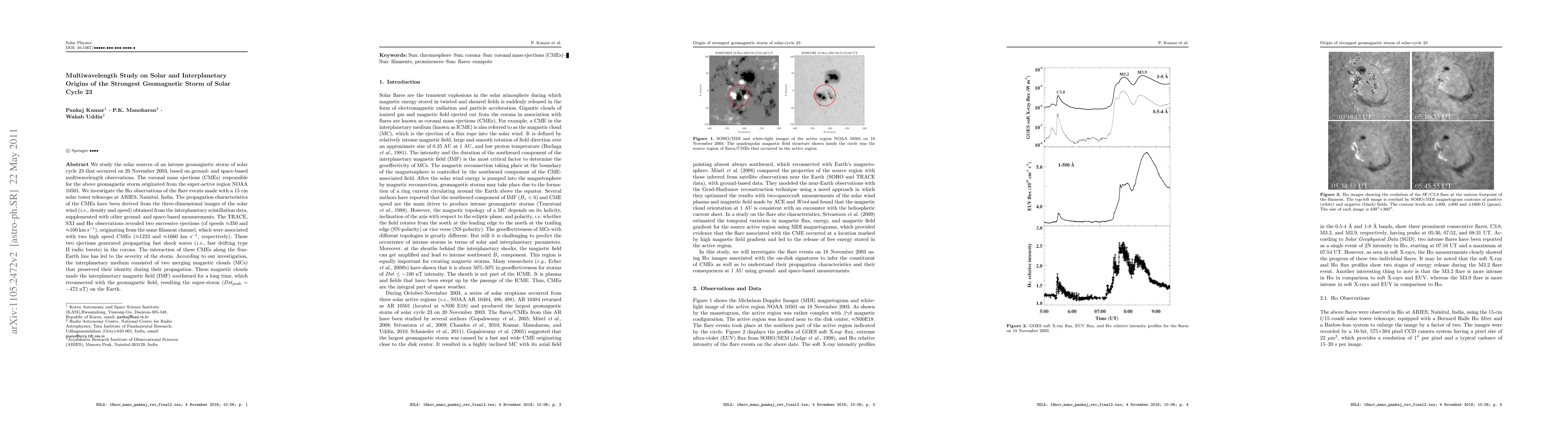 This study investigates the solar origins and interplanetary propagation of the strongest geomagnetic storm of solar cycle 23, which occurred on November 20, 2003. The storm was caused by two successive coronal mass ejections from the super-active region NOAA 10501, leading to merging magnetic clouds that generated a severe geomagnetic storm (Dst_peak=-472 nT).
