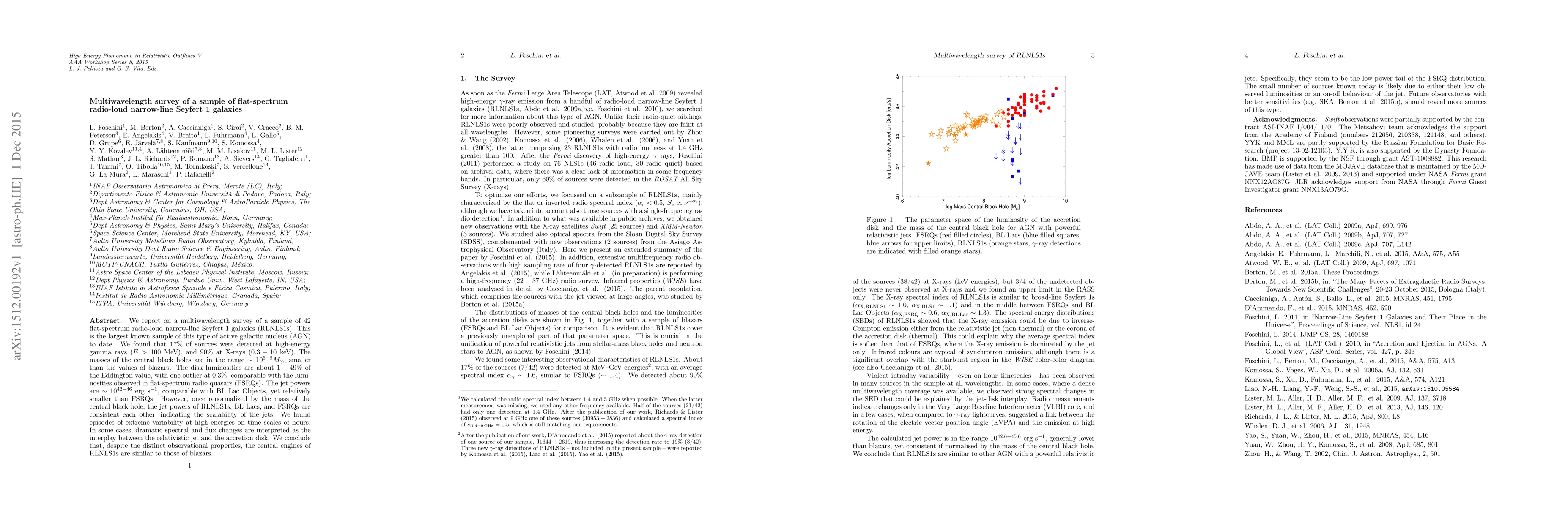 We report on a multiwavelength survey of a sample of 42 flat-spectrum radio-loud narrow-line Seyfert 1 galaxies (RLNLS1s). This is the largest known sample of this type of active galactic nucleus (AGN) to date. We found that 17% of sources were detected at high-energy gamma rays (E>100 MeV), and 90% at X-rays (0.3-10 keV). The masses of the central black holes are in the range $\sim 10^{6-8}M_{\odot}$, smaller than the values of blazars. The disk luminosities are about 1-49% of the Eddington value, with one outlier at 0.3%, comparable with the luminosities observed in flat-spectrum radio quasars (FSRQs). The jet powers are $\sim 10^{42-46}$ erg s$^{-1}$, comparable with BL Lac Objects, yet relatively smaller than FSRQs. However, once renormalized by the mass of the central black hole, the jet powers of RLNLS1s, BL Lacs, and FSRQs are consistent each other, indicating the scalability of the jets. We found episodes of extreme variability at high energies on time scales of hours. In some cases, dramatic spectral and flux changes are interpreted as the interplay between the relativistic jet and the accretion disk. We conclude that, despite the distinct observational properties, the central engines of RLNLS1s are similar to those of blazars.