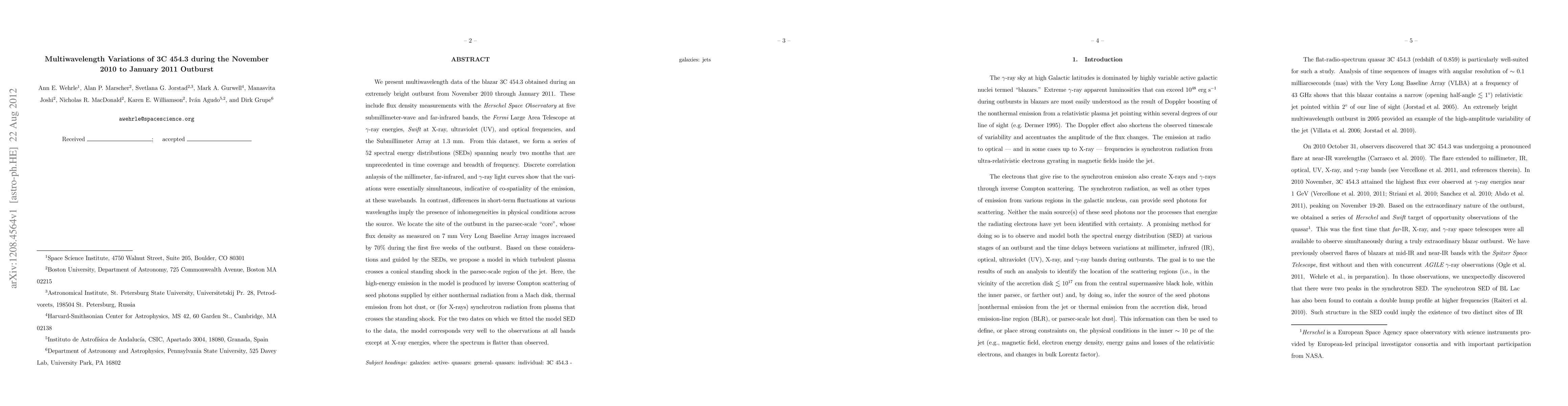 This research presents multiwavelength data of blazar 3C 454.3's extreme outburst from 2010-2011, including observations from Herschel, Fermi, Swift, and the Submillimeter Array. The study finds simultaneous variations in millimeter, far-infrared, and gamma-ray light curves, indicating co-spatial emission. The outburst source is located in the jet's parsec-scale core. A proposed model suggests turbulent plasma crossing a conical standing shock in the jet, producing high-energy emission via inverse Compton scattering. However, the model doesn't fully explain observed X-ray spectra.