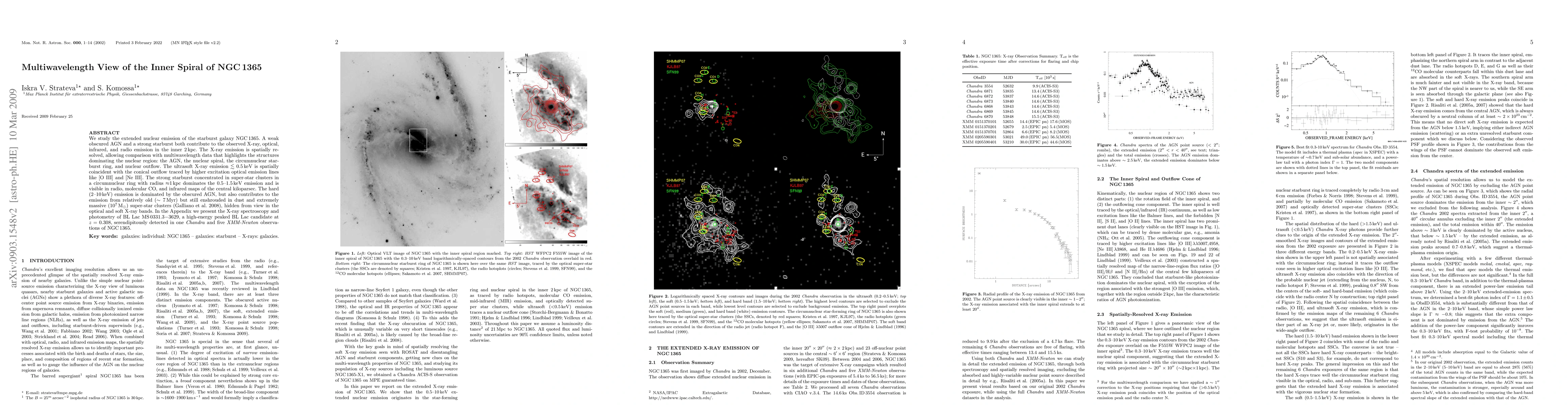 We study the extended nuclear emission of the starburst galaxy NGC 1365. A weak obscured AGN and a strong starburst both contribute to the observed X-ray, optical, infrared, and radio emission in the inner 2kpc. The X-ray emission is spatially resolved, allowing comparison with multiwavelength data that highlights the structures dominating the nuclear region: the AGN, the nuclear spiral, the circumnuclear starburst ring, and nuclear outflow. The ultrasoft X-ray emission below 0.5keV is spatially coincident with the conical outflow traced by higher excitation optical emission lines like [O III] and [Ne III]. The strong starburst concentrated in super-star clusters in a circumnuclear ring with radius ~1kpc dominates the 0.5-1.5keV emission and is visible in radio, molecular CO, and infrared maps of the central kiloparsec. The hard (2-10keV) emission is dominated by the obscured AGN, but also contributes to the emission from relatively old (~7Myr) but still enshrouded in dust and extremely massive (10^7Msun) super-star clusters (Galliano 2008), hidden from view in the optical and soft X-ray bands. In the Appendix we present the X-ray spectroscopy and photometry of BL Lac MS 0331.3-3629, a high-energy peaked BL Lac candidate at z=0.308, serendipitously detected in one Chandra and five XMM-Newton observations of NGC1365.