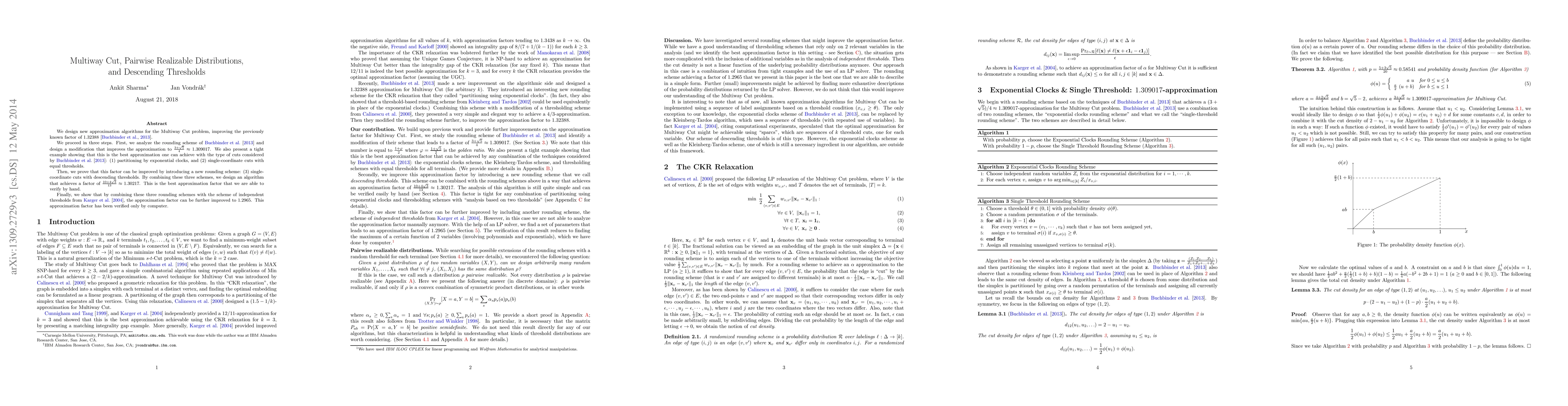 We design new approximation algorithms for the Multiway Cut problem, improving the previously known factor of 1.32388 [Buchbinder et al., 2013]. We proceed in three steps. First, we analyze the rounding scheme of Buchbinder et al., 2013 and design a modification that improves the approximation to (3+sqrt(5))/4 (approximately 1.309017). We also present a tight example showing that this is the best approximation one can achieve with the type of cuts considered by Buchbinder et al., 2013: (1) partitioning by exponential clocks, and (2) single-coordinate cuts with equal thresholds. Then, we prove that this factor can be improved by introducing a new rounding scheme: (3) single-coordinate cuts with descending thresholds. By combining these three schemes, we design an algorithm that achieves a factor of (10 + 4 sqrt(3))/13 (approximately 1.30217). This is the best approximation factor that we are able to verify by hand. Finally, we show that by combining these three rounding schemes with the scheme of independent thresholds from Karger et al., 2004, the approximation factor can be further improved to 1.2965. This approximation factor has been verified only by computer.