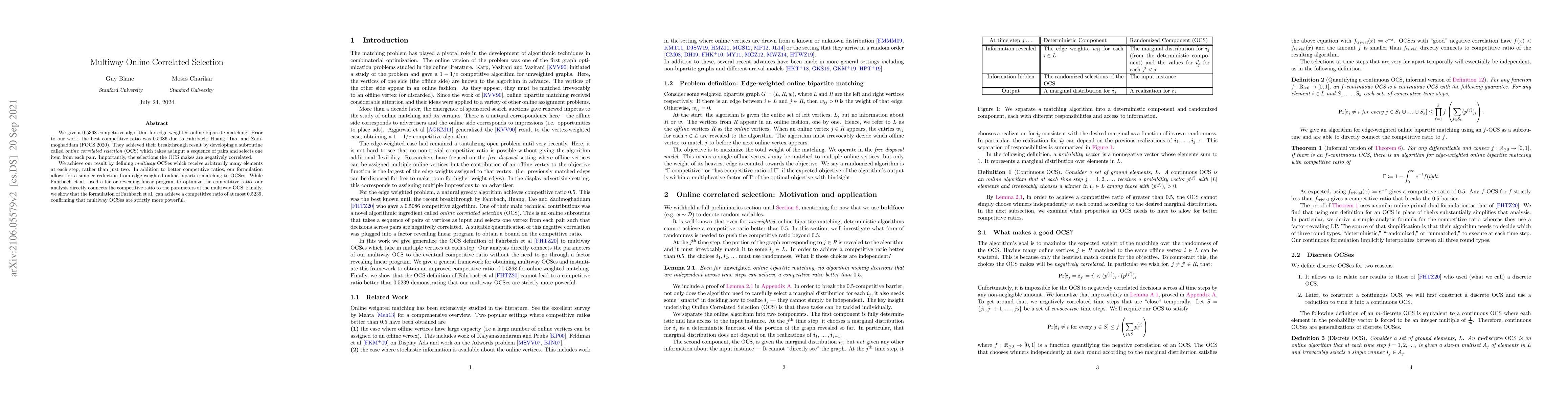 We give a $0.5368$-competitive algorithm for edge-weighted online bipartite matching. Prior to our work, the best competitive ratio was $0.5086$ due to Fahrbach, Huang, Tao, and Zadimoghaddam (FOCS 2020). They achieved their breakthrough result by developing a subroutine called \emph{online correlated selection} (OCS) which takes as input a sequence of pairs and selects one item from each pair. Importantly, the selections the OCS makes are negatively correlated. We achieve our result by defining \emph{multiway} OCSes which receive arbitrarily many elements at each step, rather than just two. In addition to better competitive ratios, our formulation allows for a simpler reduction from edge-weighted online bipartite matching to OCSes. While Fahrbach et al. used a factor-revealing linear program to optimize the competitive ratio, our analysis directly connects the competitive ratio to the parameters of the multiway OCS. Finally, we show that the formulation of Farhbach et al. can achieve a competitive ratio of at most $0.5239$, confirming that multiway OCSes are strictly more powerful.
