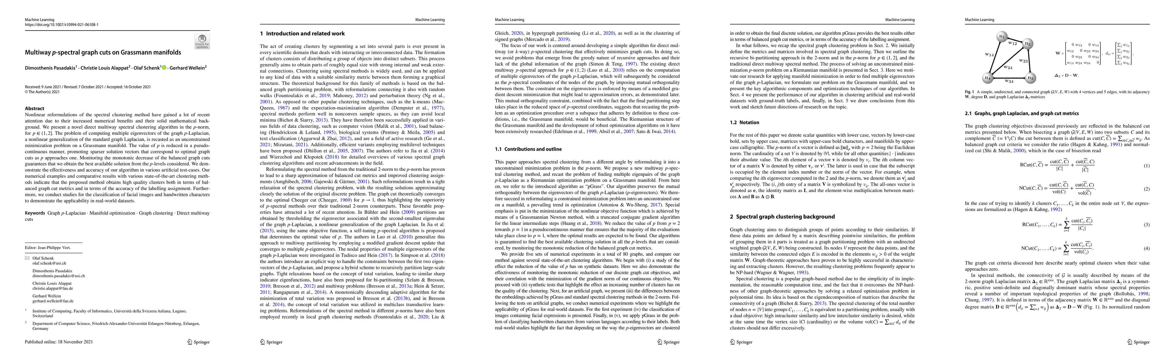 This paper introduces a novel multiway spectral clustering algorithm based on $p$-spectral graph cuts on Grassmann manifolds, which reformulates the computation of multiple eigenvectors of the graph $p$-Laplacian as an unconstrained optimization problem. The method demonstrates high-quality clustering and accurate labeling, as shown through various test cases and real-world datasets like facial images and handwritten characters.