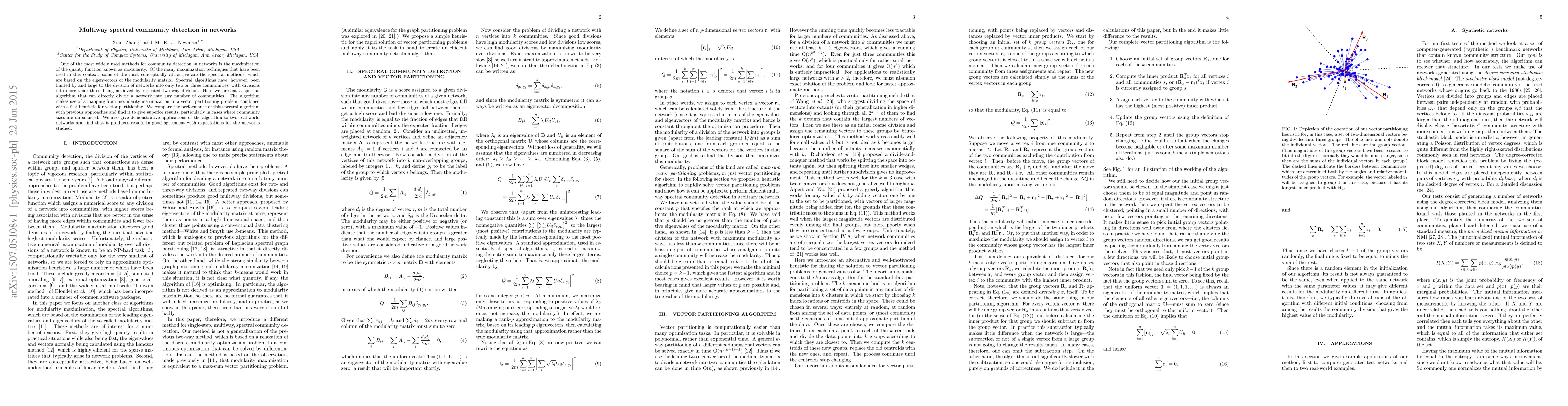 One of the most widely used methods for community detection in networks is the maximization of the quality function known as modularity. Of the many maximization techniques that have been used in this context, some of the most conceptually attractive are the spectral methods, which are based on the eigenvectors of the modularity matrix. Spectral algorithms have, however, been limited by and large to the division of networks into only two or three communities, with divisions into more than three being achieved by repeated two-way division. Here we present a spectral algorithm that can directly divide a network into any number of communities. The algorithm makes use of a mapping from modularity maximization to a vector partitioning problem, combined with a fast heuristic for vector partitioning. We compare the performance of this spectral algorithm with previous approaches and find it to give superior results, particularly in cases where community sizes are unbalanced. We also give demonstrative applications of the algorithm to two real-world networks and find that it produces results in good agreement with expectations for the networks studied.