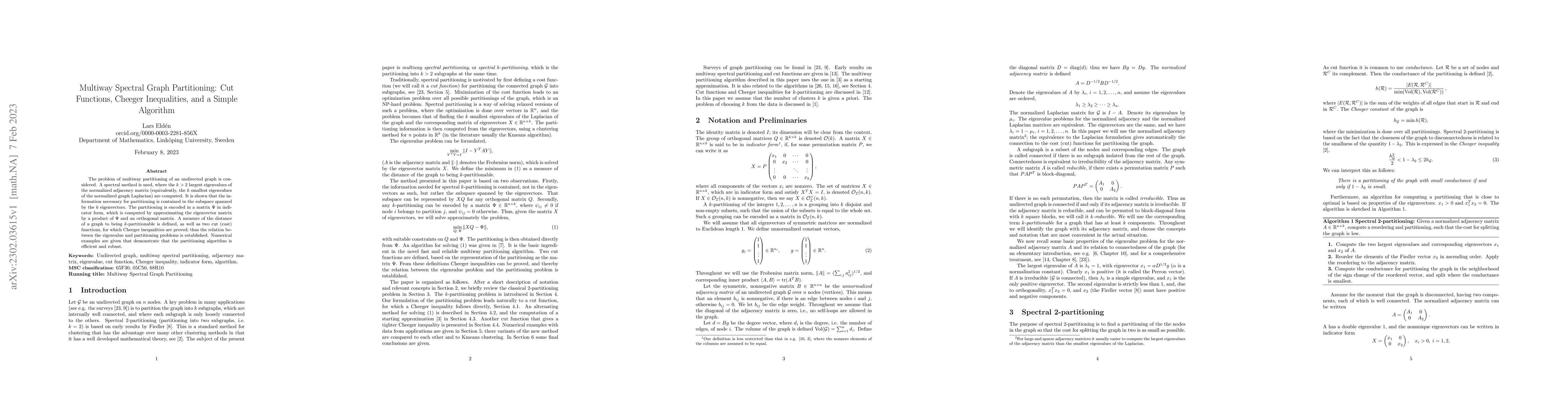 This paper proposes a spectral method for multiway graph partitioning using the k largest eigenvalues of the normalized adjacency matrix. It defines a measure of graph k-partitionability and proves Cheeger inequalities relating eigenvalues to partitioning cost functions, demonstrating the algorithm's efficiency and robustness through numerical examples.