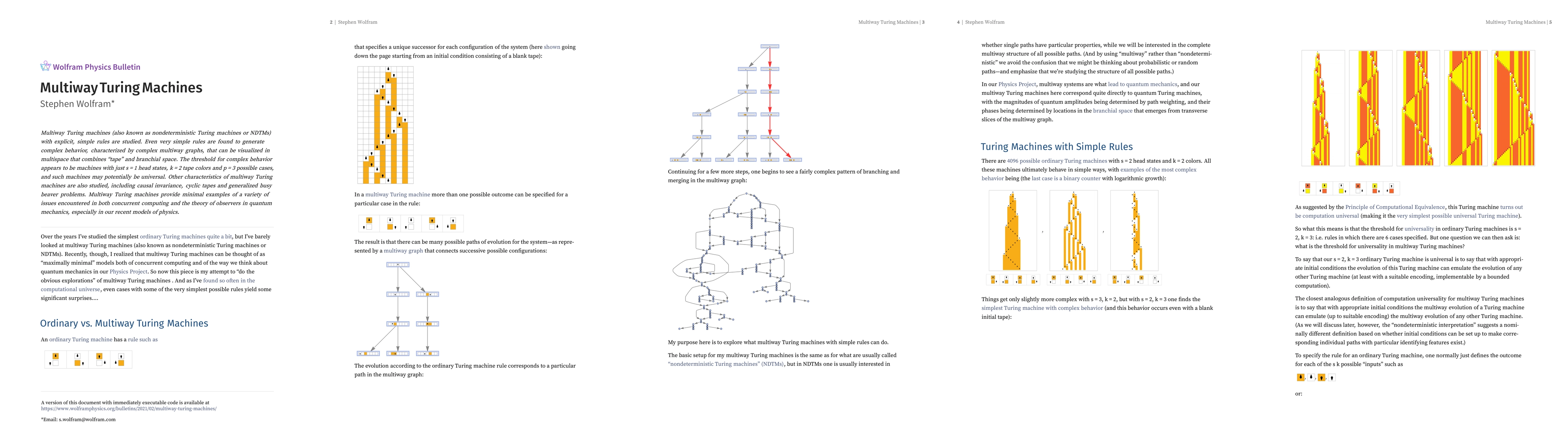 Multiway Turing machines, with simple rules and a small number of head states, tape colors, and cases, exhibit complex behavior and potentially universal computation. They also address issues in concurrent computing and quantum mechanics.