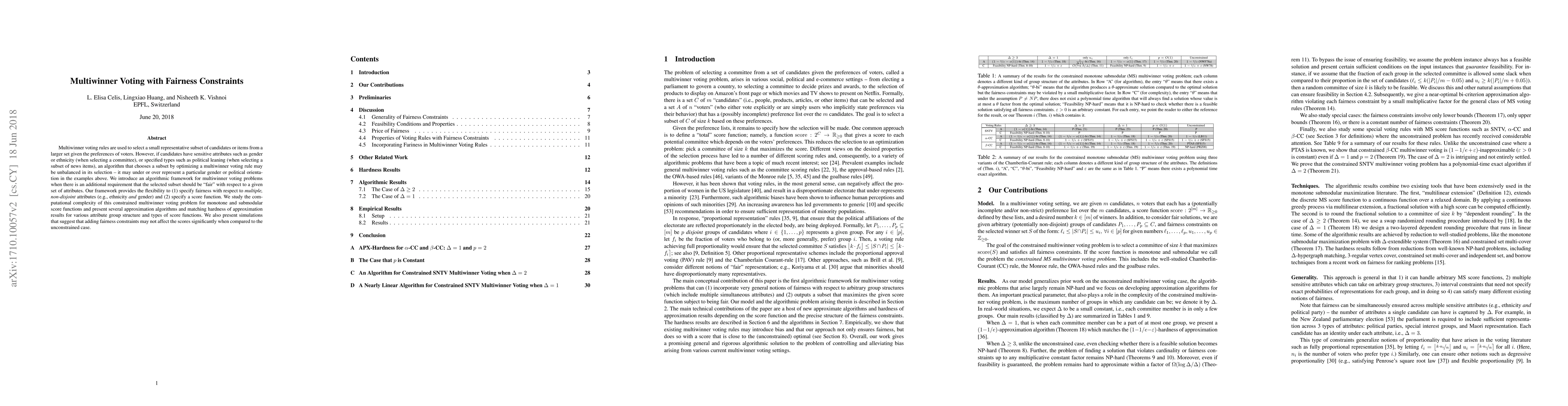 The paper proposes a framework for multiwinner voting with fairness constraints, allowing for multiple non-disjoint attributes and a specified score function. It studies the computational complexity of this constrained problem for monotone and submodular score functions, presenting approximation algorithms and hardness of approximation results.