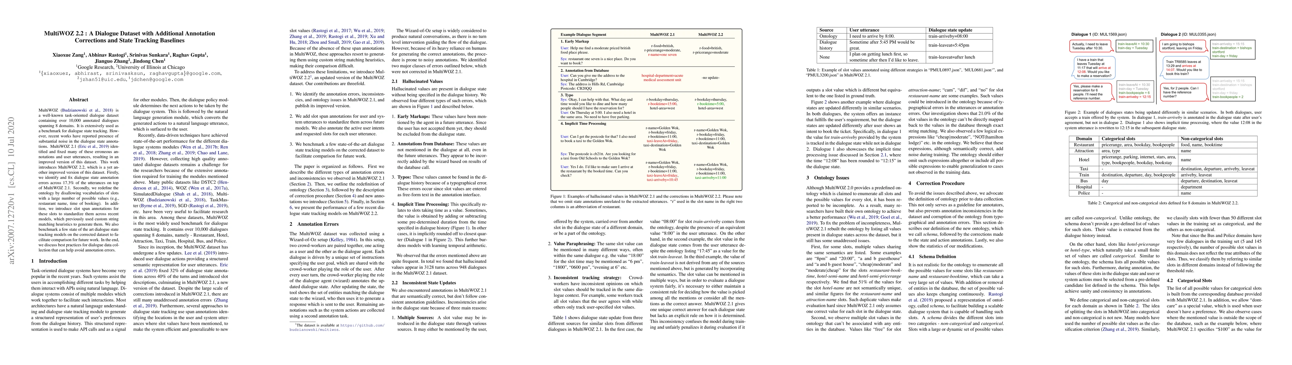 MultiWOZ 2.2 refines the MultiWOZ dataset by correcting errors in dialogue state annotations and redefining the ontology to improve consistency. It also introduces standardized slot span annotations and benchmarks state-of-the-art dialogue state tracking models on the corrected dataset.