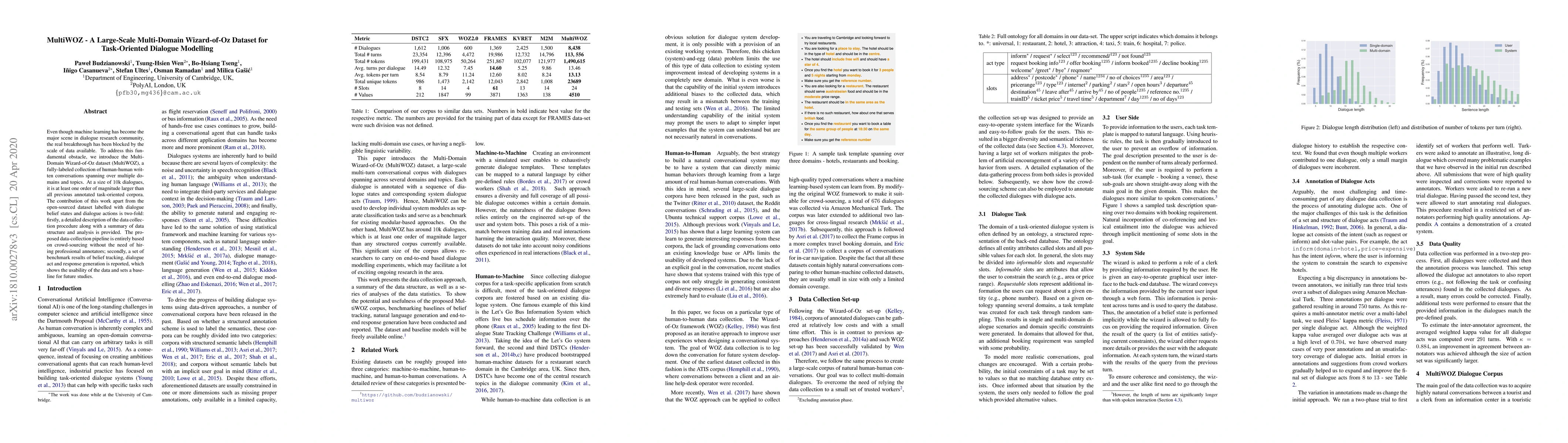 The MultiWOZ dataset, a large-scale, crowd-sourced collection of 10k multi-domain human-human dialogues, aims to address the data scarcity in dialogue research. It provides a detailed data collection procedure and benchmark results for belief tracking, dialogue act, and response generation, setting a new baseline for future studies.
