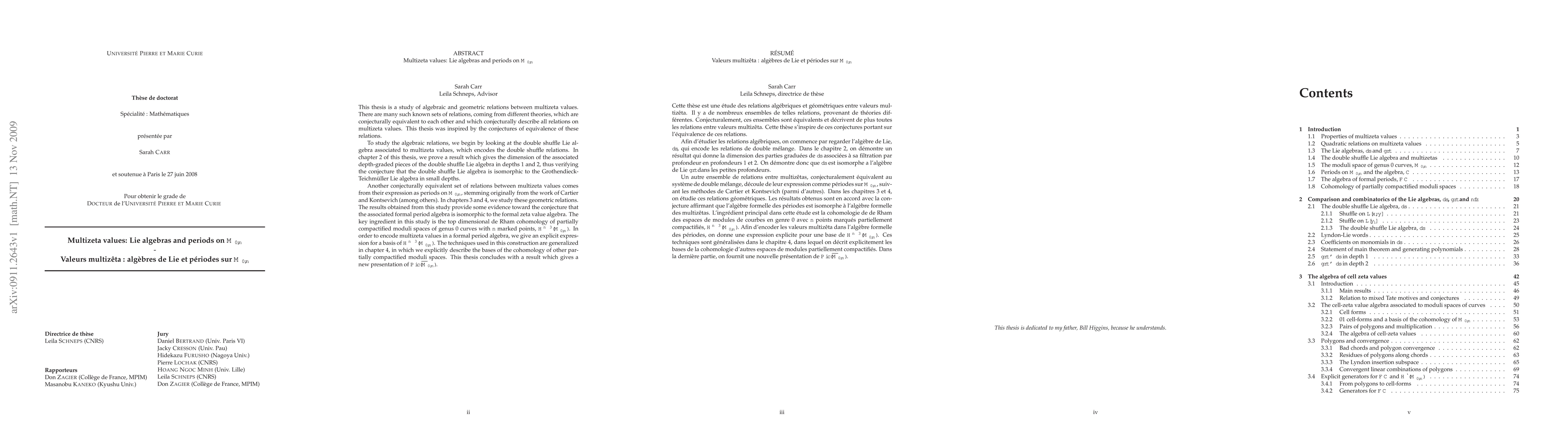 This thesis investigates algebraic and geometric connections between multizeta values, proving dimensions of the double shuffle Lie algebra's graded pieces and expressing multizeta values as periods on $\mathfrak{M}_{0,n}$ via their de Rham cohomology. It concludes with a new presentation for $Pic(\overline{\mathfrak{M}}_{0,n})$.