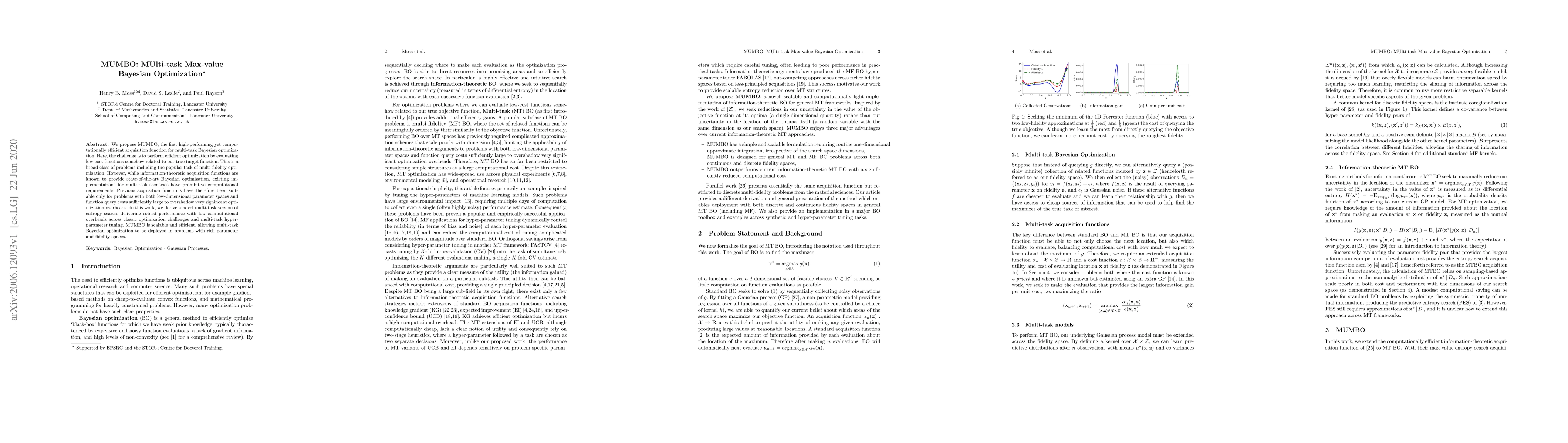 MUMBO is a novel acquisition function for multi-task Bayesian optimization that balances high performance with computational efficiency, enabling scalable and effective optimization across complex parameter and fidelity spaces. It offers a scalable solution to multi-fidelity optimization challenges by reducing computational overheads.