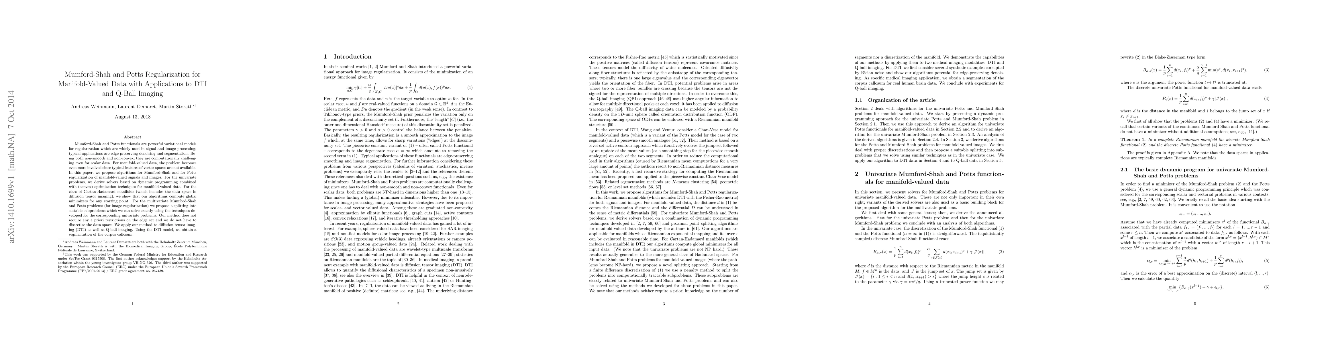 This paper proposes algorithms for Mumford-Shah and Potts regularization for manifold-valued data, specifically addressing DTI and Q-ball imaging. The authors develop dynamic programming and optimization techniques to compute global minimizers for Cartan-Hadamard manifolds, achieving edge-preserving segmentation without discretization.