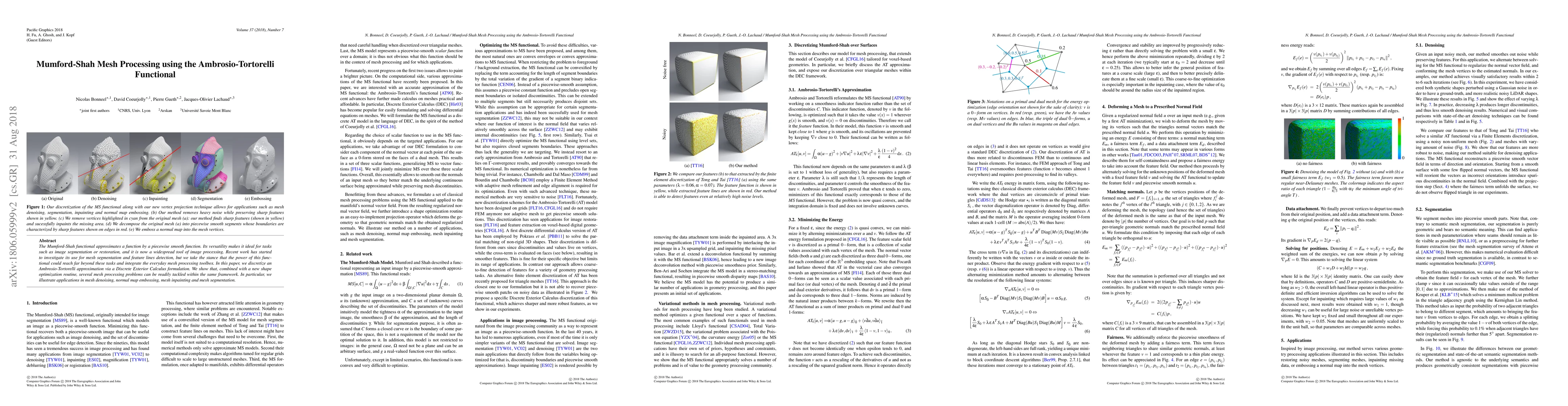 This paper explores the use of the Ambrosio-Tortorelli functional to discretize the Mumford-Shah functional for mesh processing, demonstrating its effectiveness in tasks like mesh denoising, normal map embossing, mesh inpainting, and segmentation through a new shape optimization routine.