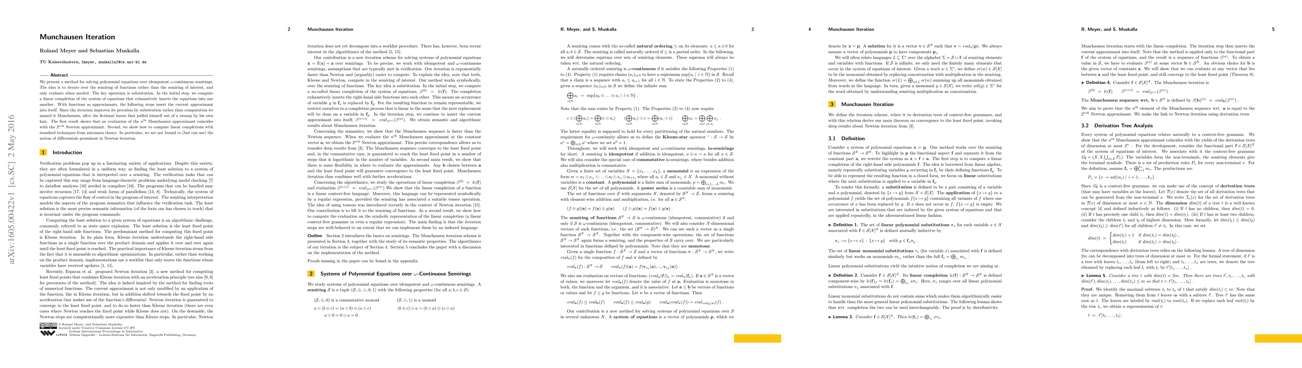 This paper introduces the Munchausen Iteration method for solving polynomial equations over idempotent omega-continuous semirings by iterating over functions and substituting approximations. It compares the n-th Munchausen approximant to the 2^n-th Newton approximant and leverages automata theory for computing linear completions.