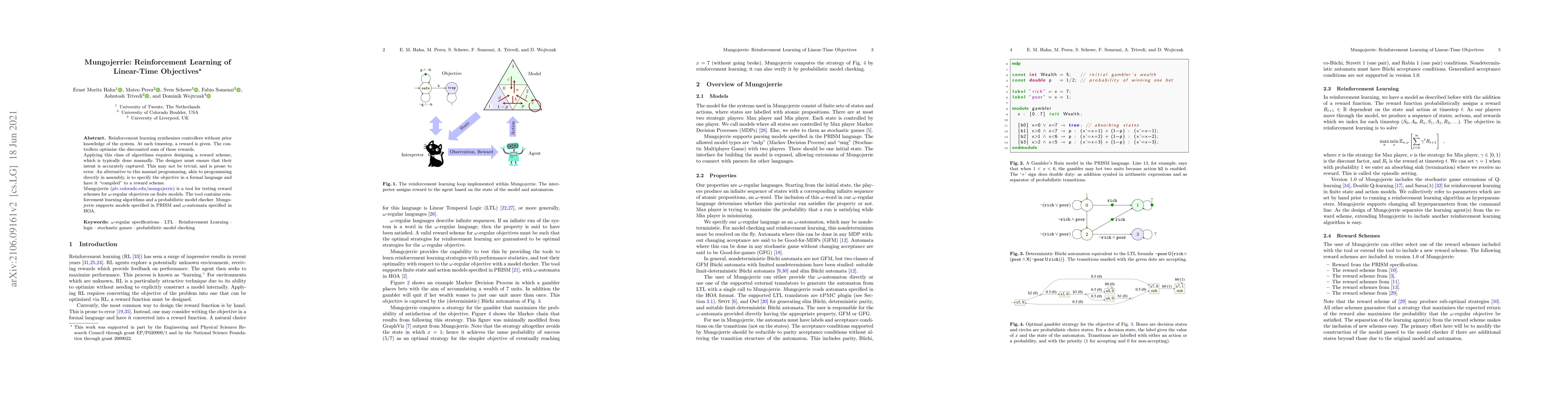 Reinforcement learning synthesizes controllers without prior knowledge of the system. At each timestep, a reward is given. The controllers optimize the discounted sum of these rewards. Applying this class of algorithms requires designing a reward scheme, which is typically done manually. The designer must ensure that their intent is accurately captured. This may not be trivial, and is prone to error. An alternative to this manual programming, akin to programming directly in assembly, is to specify the objective in a formal language and have it "compiled" to a reward scheme. Mungojerrie (https://plv.colorado.edu/mungojerrie/) is a tool for testing reward schemes for $\omega$-regular objectives on finite models. The tool contains reinforcement learning algorithms and a probabilistic model checker. Mungojerrie supports models specified in PRISM and $\omega$-automata specified in HOA.