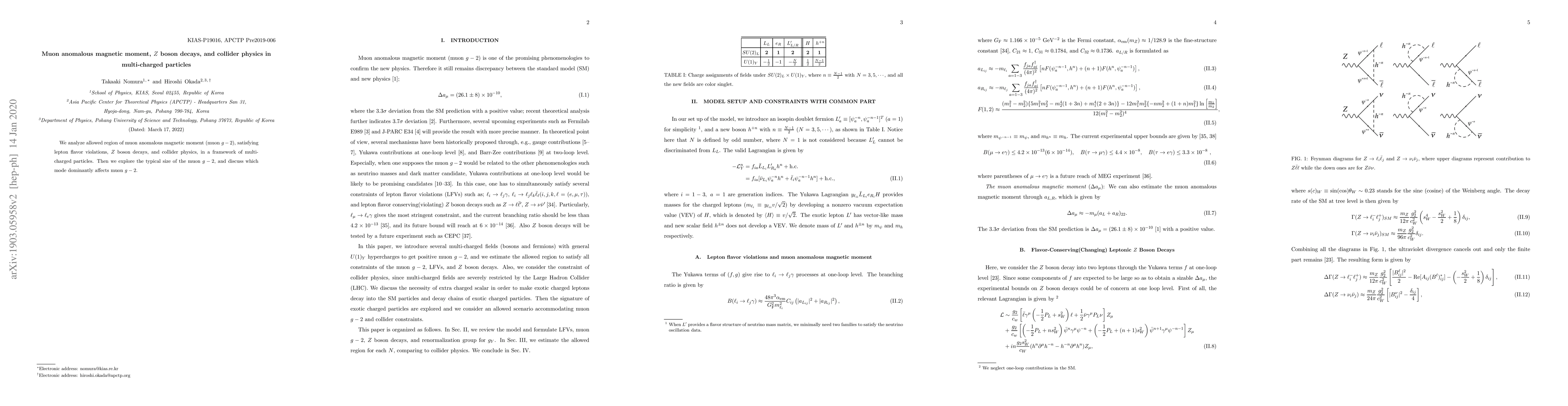 Summary: This paper investigates the muon anomalous magnetic moment ($g-2$), considering lepton flavor violations, $Z$ boson decays, and collider physics within a framework of multi-charged particles, and identifies the dominant decay modes affecting the muon $g-2$.