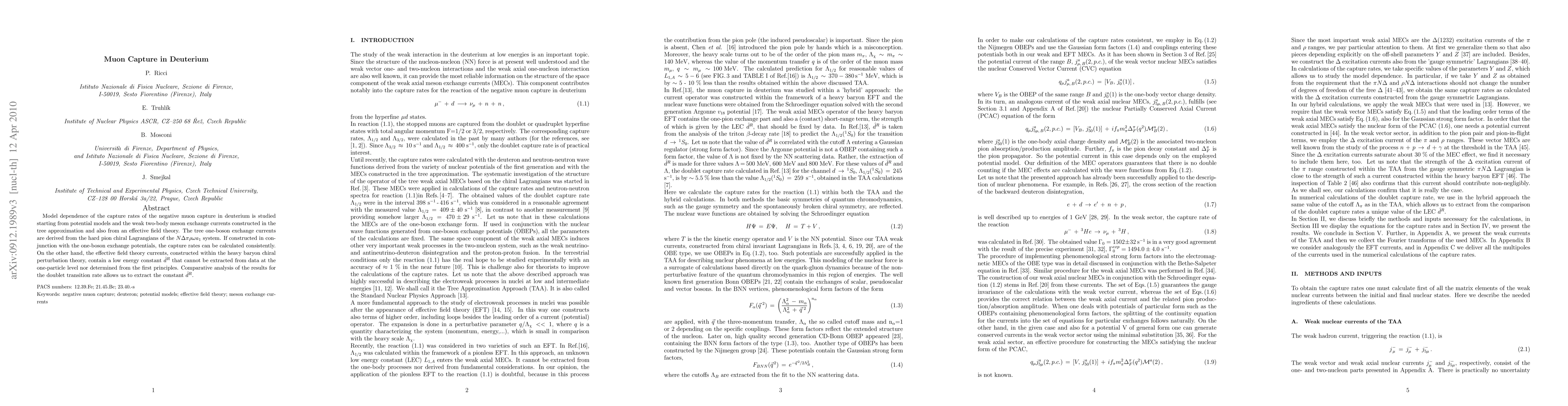 Model dependence of the capture rates of the negative muon capture in deuterium is studied starting from potential models and the weak two-body meson exchange currents constructed in the tree approximation and also from an effective field theory. The tree one-boson exchange currents are derived from the hard pion chiral Lagrangians of the $N \Delta \pi \rho \omega a_1$ system. If constructed in conjunction with the one-boson exchange potentials, the capture rates can be calculated consistently. On the other hand, the effective field theory currents, constructed within the heavy baryon chiral perturbation theory, contain a low energy constant $\hat d ^R$ that cannot be extracted from data at the one-particle level nor determined from the first principles. Comparative analysis of the results for the doublet transition rate allows us to extract the constant $\hat d ^R$.