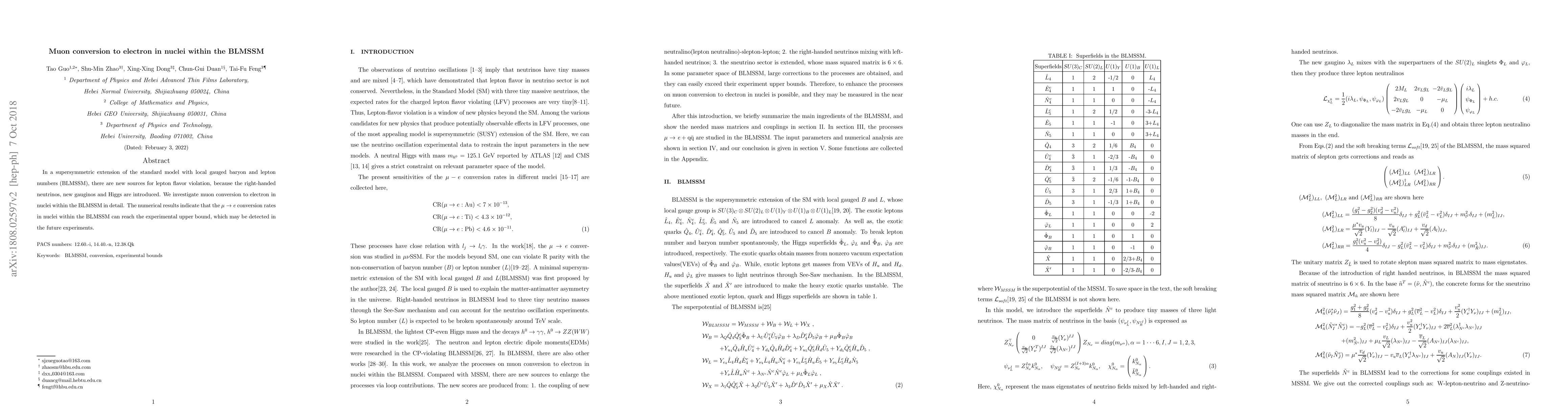 This paper explores muon conversion to electron in nuclei within the BLMSSM, a supersymmetric extension of the Standard Model, highlighting new sources of lepton flavor violation due to right-handed neutrinos, new gauginos, and Higgs. The study finds that the conversion rates may reach experimental limits, potentially detectable in future experiments.