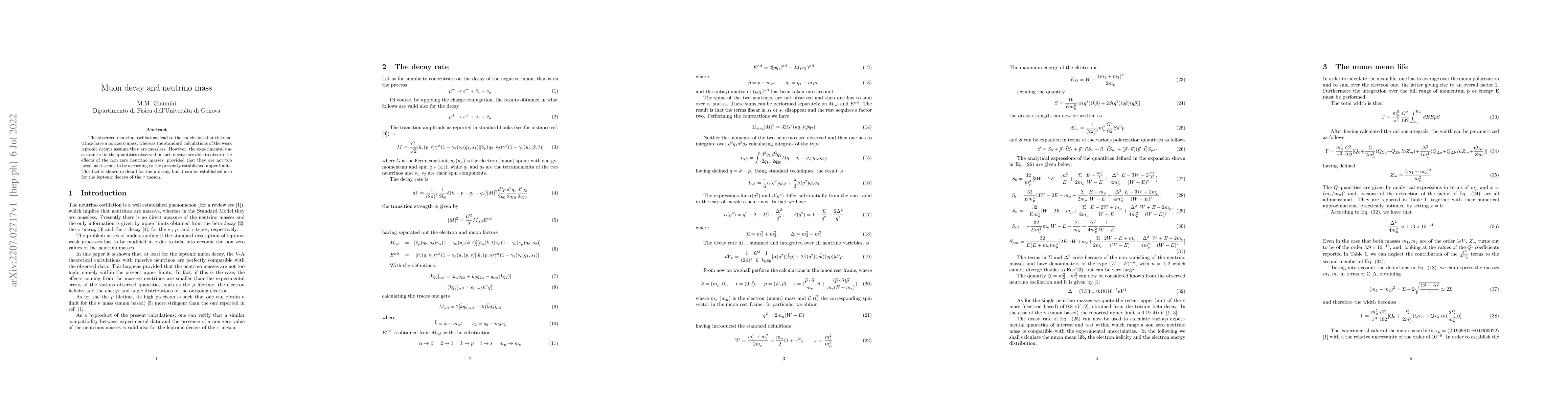 This paper investigates how observed neutrino oscillations imply non-zero neutrino masses, challenging the standard assumption of massless neutrinos in weak decay calculations. It demonstrates that current experimental uncertainties in muon decay can accommodate these masses, consistent with established upper limits.