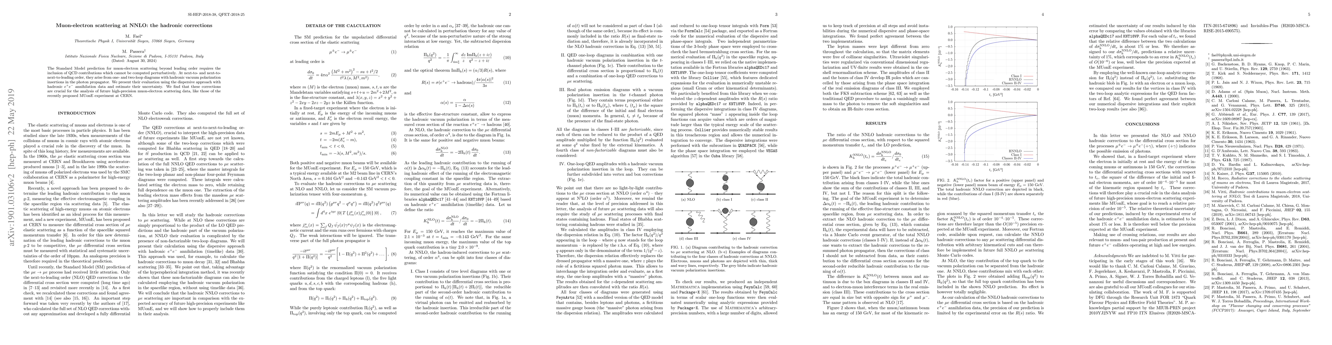 This paper evaluates QCD contributions to muon-electron scattering at next-to-next-to-leading order using a dispersive approach based on hadronic $e^+e^-$ annihilation data. These corrections are essential for interpreting future high-precision data from the MUonE experiment at CERN.