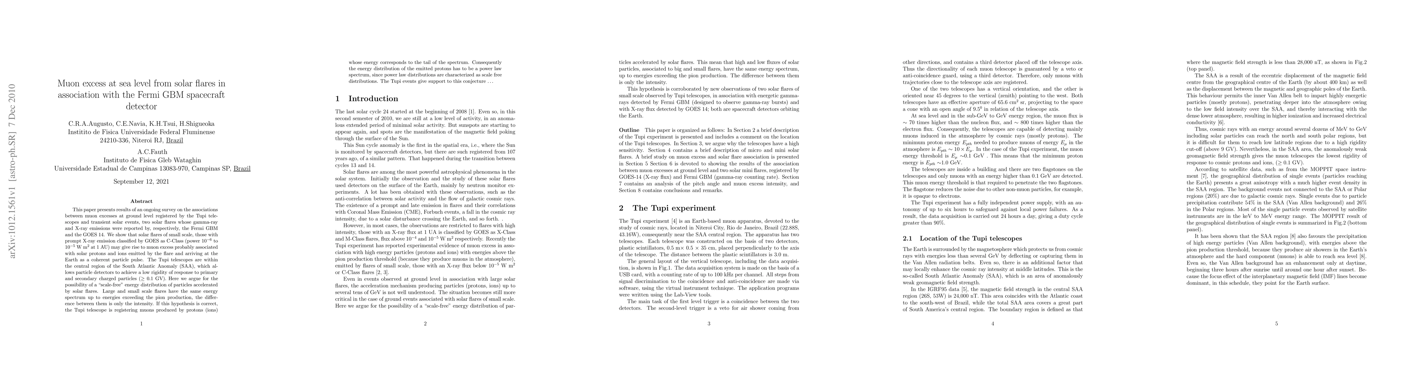 This paper presents results of an ongoing survey on the associations between muon excesses at ground level registered by the Tupi telescopes and transient solar events, two solar flares whose gamma-ray and X-ray emissions were reported by, respectively, the Fermi GBM and the GOES 14. We show that solar flares of small scale, those with prompt X-ray emission classified by GOES as C-Class (power $10^{-6}$ to $10^{-5}$ W m$^2$ at 1 AU) may give rise to muon excess probably associated with solar protons and ions emitted by the flare and arriving at the Earth as a coherent particle pulse. The Tupi telescopes are within the central region of the South Atlantic Anomaly (SAA), which allows particle detectors to achieve a low rigidity of response to primary and secondary charged particles ($\geq 0.1$ GV). Here we argue for the possibility of a "scale-free" energy distribution of particles accelerated by solar flares. Large and small scale flares have the same energy spectrum up to energies exceeding the pion production, the difference between them is only the intensity. If this hypothesis is correct, the Tupi telescope is registering muons produced by protons (ions) whose energy corresponds to the tail of the spectrum. Consequently the energy distribution of the emitted protons has to be a power law spectrum, since power law distributions are characterized as scale free distributions. The Tupi events give support to this conjecture.