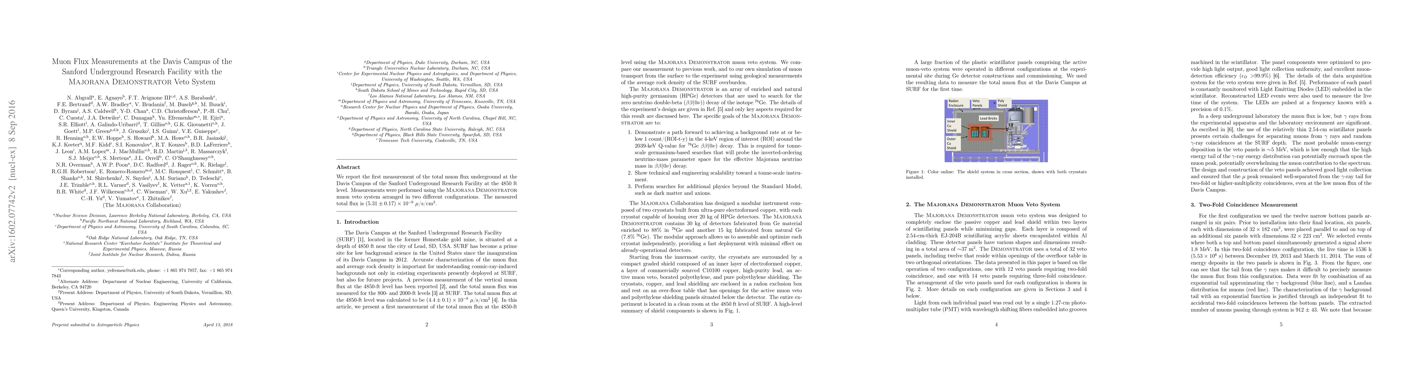 This paper reports the first measurement of the total muon flux underground at the Davis Campus of the Sanford Underground Research Facility using the Majorana Demonstrator veto system, yielding a flux of (5.31±0.17) x 10^-9 muons/s/cm^2 at a depth of 4850 ft. The measurements were conducted in two different configurations.