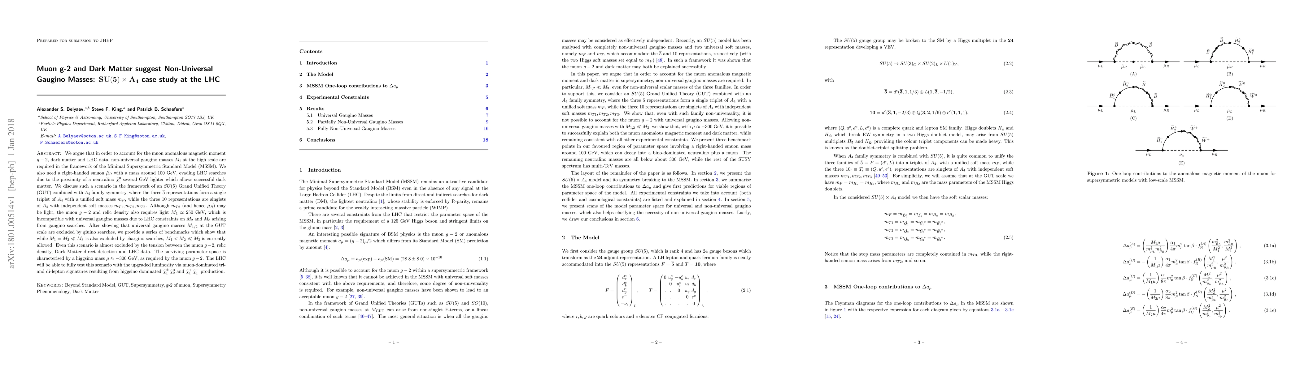 We argue that in order to account for the muon anomalous magnetic moment $g-2$, dark matter and LHC data, non-universal gaugino masses $M_i$ at the high scale are required in the framework of the Minimal Supersymmetric Standard Model (MSSM). We also need a right-handed smuon $\tilde\mu_R$ with a mass around 100 GeV, evading LHC searches due to the proximity of a neutralino $\tilde{\chi}^0_1$ several GeV lighter which allows successful dark matter. We discuss such a scenario in the framework of an $SU(5)$ Grand Unified Theory (GUT) combined with $A_4$ family symmetry, where the three $\overline{5}$ representations form a single triplet of $A_4$ with a unified soft mass $m_F$, while the three $10$ representations are singlets of $A_4$ with independent soft masses $m_{T1}, m_{T2}, m_{T3}$. Although $m_{T2}$ (and hence $\tilde\mu_R$) may be light, the muon $g-2$ and relic density also requires light $M_1\simeq 250$ GeV, which is incompatible with universal gaugino masses due to LHC constraints on $M_2$ and $M_3$ arising from gaugino searches. After showing that universal gaugino masses $M_{1/2}$ at the GUT scale are excluded by gluino searches, we provide a series of benchmarks which show that while $M_{1}= M_{2} \ll M_3$ is also excluded by chargino searches, $M_{1}< M_{2} \ll M_3$ is currently allowed. Even this scenario is almost excluded by the tension between the muon $g-2$, relic density, Dark Matter direct detection and LHC data. The surviving parameter space is characterised by a higgsino mass $\mu \approx -300$ GeV, as required by the muon $g-2$. The LHC will be able to fully test this scenario with the upgraded luminosity via muon-dominated tri- and di-lepton signatures resulting from higgsino dominated $\tilde{\chi}^\pm_1 \, \tilde{\chi}^0_2$ and $\tilde{\chi}^+_1 \, \tilde{\chi}^-_1$ production.