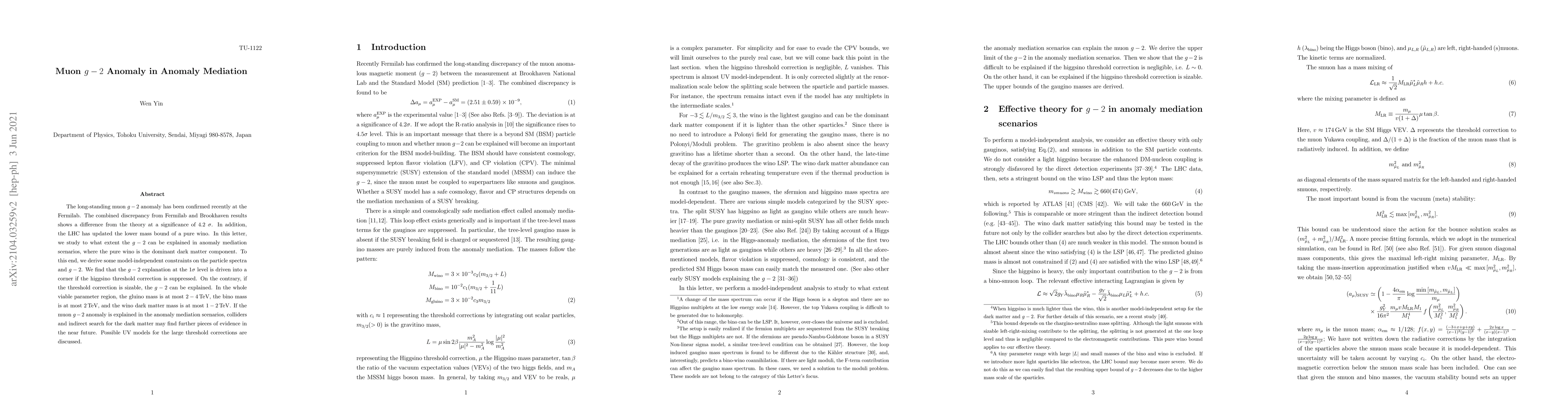 This paper investigates how the muon $g-2$ anomaly can be explained within anomaly mediation scenarios, finding that sizable higgsino threshold corrections are necessary for a viable explanation. The study also constrains the masses of gluino, bino, and wino dark matter, suggesting colliders and dark matter searches may provide further evidence.